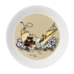 Тарелка Arabia Moomin Muskrat 19 cm (1069395) с изображением Ондатры из Муми-Аравии. Ондатра — глубоко вдумчивый персонаж, который погружается в мрачные философские книги и любит делиться своими пессимистическими взглядами с другими. Он предпочитает проводить время в гамаке семьи Муми-троллей со своей любимой книгой. К сожалению, он слишком часто переживает самое страшное, что ему знакомо, — потерю достоинства, что является повторяющимся событием в Муми-доме.