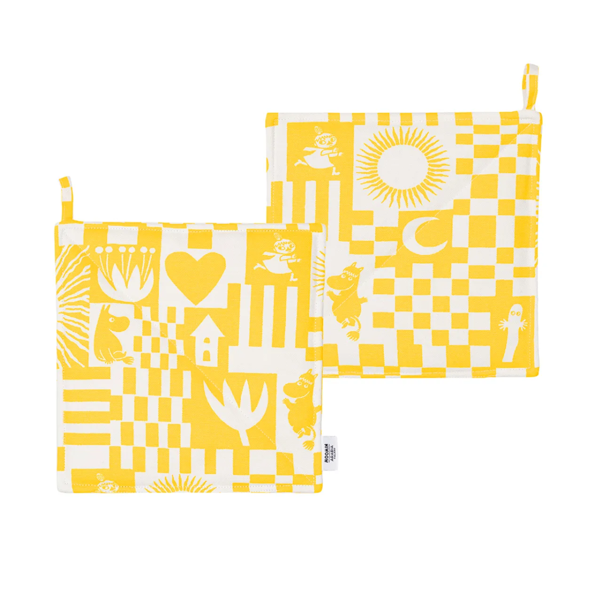 Набор прихваток для кастрюль Arabia Moomin Party (1077465) из серии «Party yellow» от Moomin Arabia привнесет игривую атмосферу лета прямо на кухню. Коллекция Party вдохновлена ранними образцами «Мумий» 1950-х годов и наполнена забавными деталями и очаровательными персонажами, которые создают уникальную и ностальгическую атмосферу.