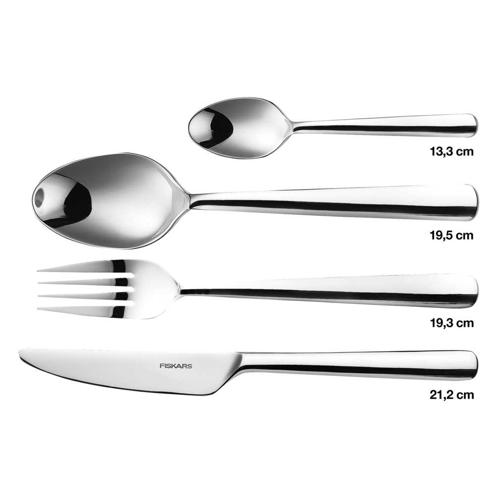 Набір столових приборів Fiskars Functional Form™ Polished 16 шт. (1002946) елегантний, функціональний та сучасний. Набір складається з чотирьох наборів по 4 предметів, кожен з яких складається зі столового ножа, вилки, столової ложки та чайної ложки. І з функціональності, і з дизайну всі деталі чудово доповнюють одна одну. Вигини ложок відбиваються в закруглених формах ножа та виделки, довгі вузькі ніжки надають гармонійної єдності та сучасного штриху. Простий дизайн, підкреслений його глянсовою поверхнею, робить набір столових приладів стильним супутником у повсякденному житті та в особливих випадках.