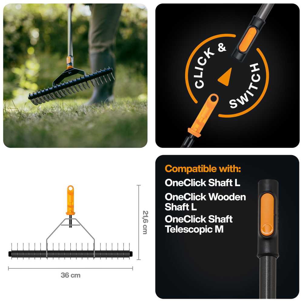 Загартована головка з вуглецевої сталі ефективно видаляє мох і солому з газону, забезпечуючи краще поглинання води та здоровіший ріст трави. Завдяки системі Fiskars OneClick, головка інструменту автоматично та надійно фіксується на сумісних ручках Multisystem, забезпечуючи стабільну та безпечну роботу. Модульна система дозволяє використовувати кілька головок інструменту з однією ручкою, заощаджуючи місце для зберігання та спрощуючи транспортування. Міцна конструкція з загартованої вуглецевої сталі забезпечує тривалий термін служби та надійну роботу навіть за інтенсивного використання.