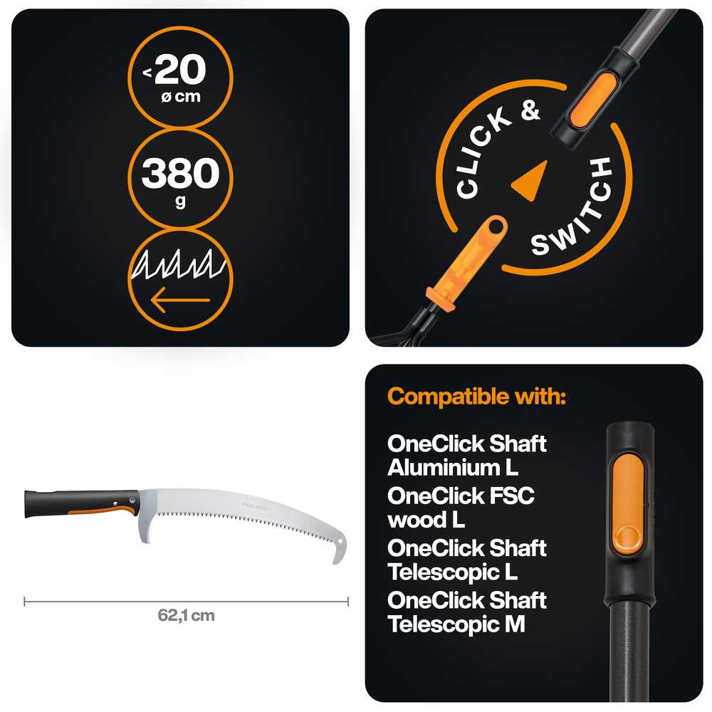Вигнуте пильне полотно забезпечує швидкий, потужний та чистий розріз, мінімізуючи пошкодження дерева. Гачок на кінці пильного полотна забезпечує додаткову стабільність під час розрізання та запобігає зісковзуванню пилки з гілки. Додаткове ріжуче лезо вбудоване внизу, що забезпечує точний та чистий розріз знизу. Завдяки системі блокування OneClick , головка пилки автоматично та надійно фіксується на ручці, що дозволяє безпечно працювати на висоті.