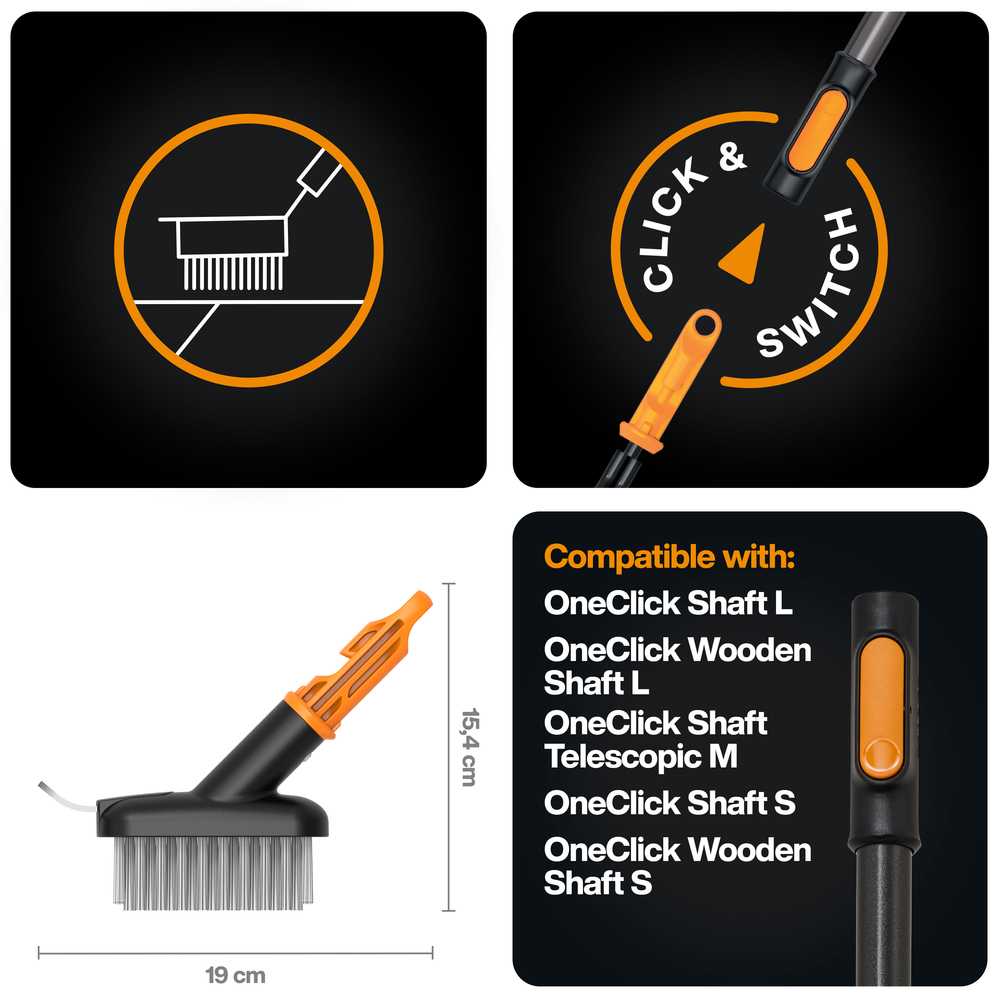 Загартована сталева передня пластина в поєднанні з міцною сталевою щетиною ефективно видаляє мох та бур'яни зі стиків та швів між бруківкою. Навіть стійкий бруд ретельно розпушується, тому ваш сад та двір одразу ж знову виглядають охайними. Завдяки інноваційній системі OneClick щітка автоматично та надійно фіксується в ручці, що дозволяє вам працювати безпечно та стабільно, а також легко перемикатися між різними насадками. Високоякісні матеріали та точна конструкція гарантують тривалий термін служби та надійну роботу навіть за інтенсивного використання. Модульна система також підтримує порядок у вашому сараї, оскільки кілька головок інструментів можна використовувати з однією ручкою.