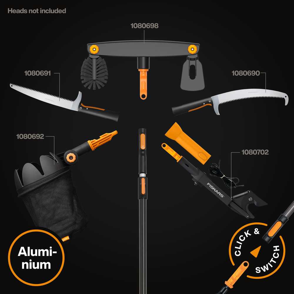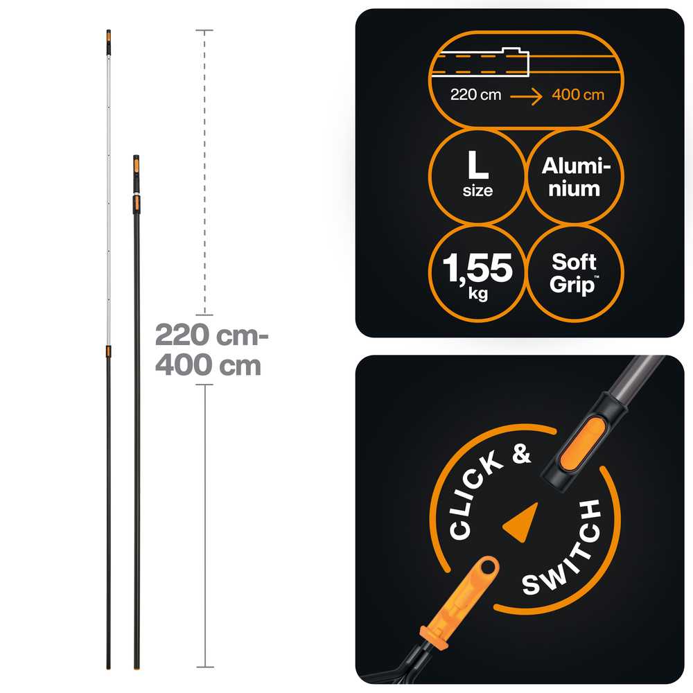 Ручка плавно регулюється від 220 см до 400 см , що дозволяє досягати максимальної робочої висоти приблизно 6 метрів . Це дозволяє обрізати високі гілки, чистити жолоби або виконувати інші завдання без драбини. Система Fiskars OneClick забезпечує швидке та надійне кріплення насадок, дозволяючи вам легко перемикатися між різними садовими завданнями. Завдяки автоматичному механізму блокування ручку можна відрегулювати на потрібну довжину за лічені секунди, і вона одразу готова до використання. Легка алюмінієва конструкція пропонує чудовий баланс між міцністю та комфортом, зменшуючи втому під час тривалого використання. Ручка розроблена для універсального використання , від обрізки та очищення до технічного обслуговування у важкодоступних місцях.