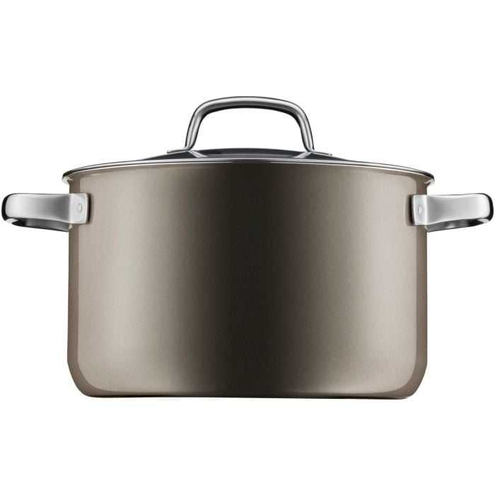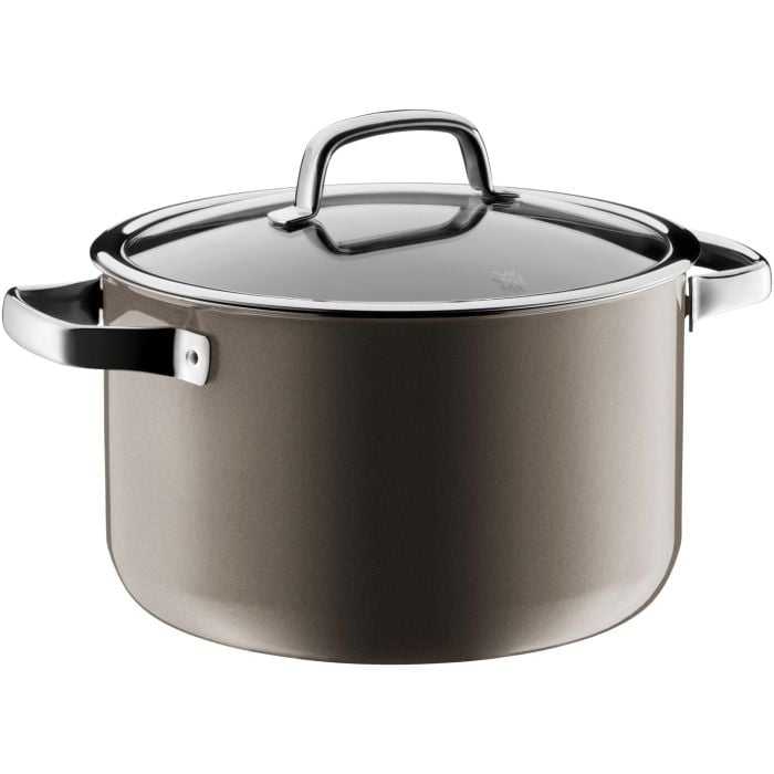 Кастрюля WMF Fusiontec Mineral 6,4 л (0514475290) для приготовления мяса и варки овощей. Кастрюля имеет ручки из нержавеющей стали и стеклянную крышку.