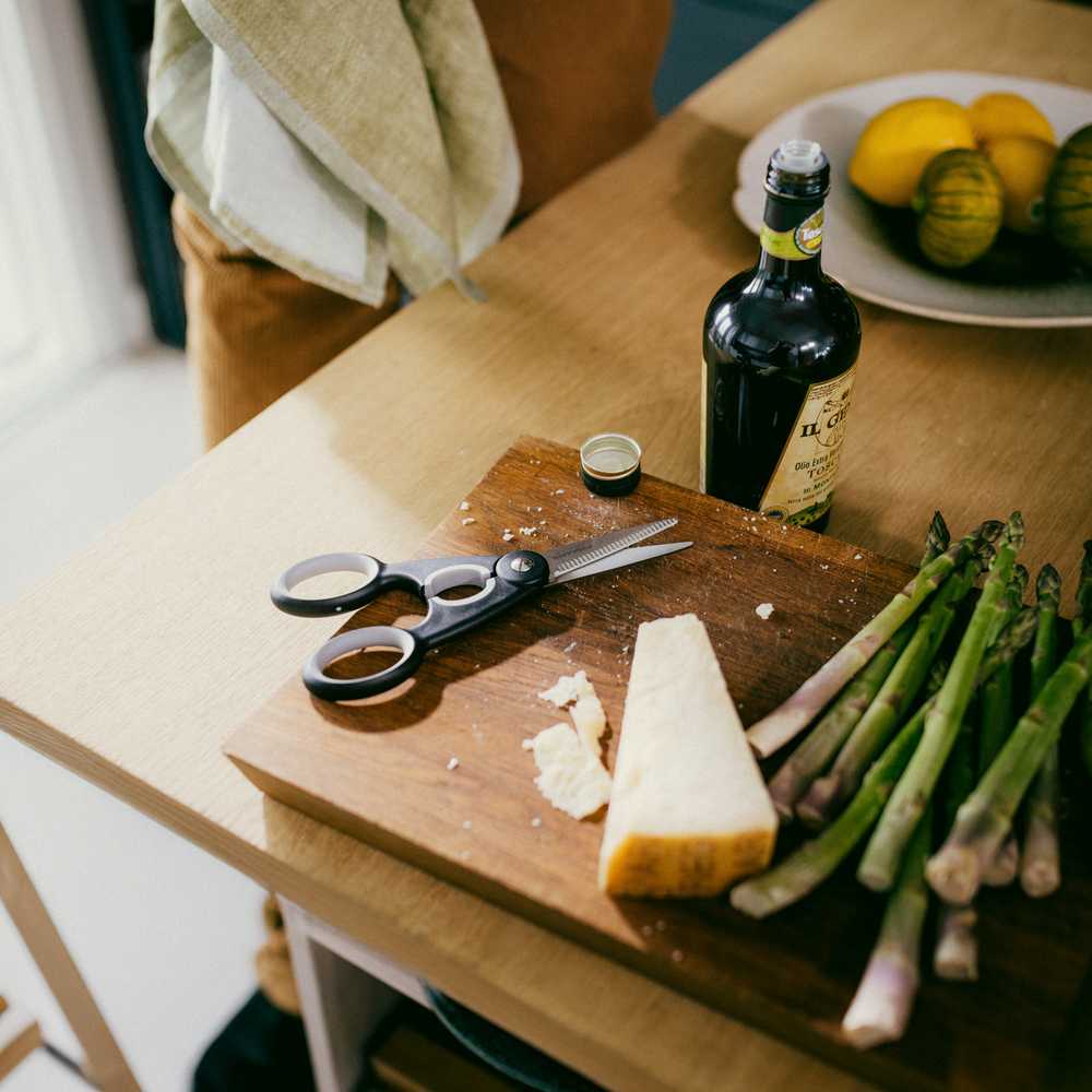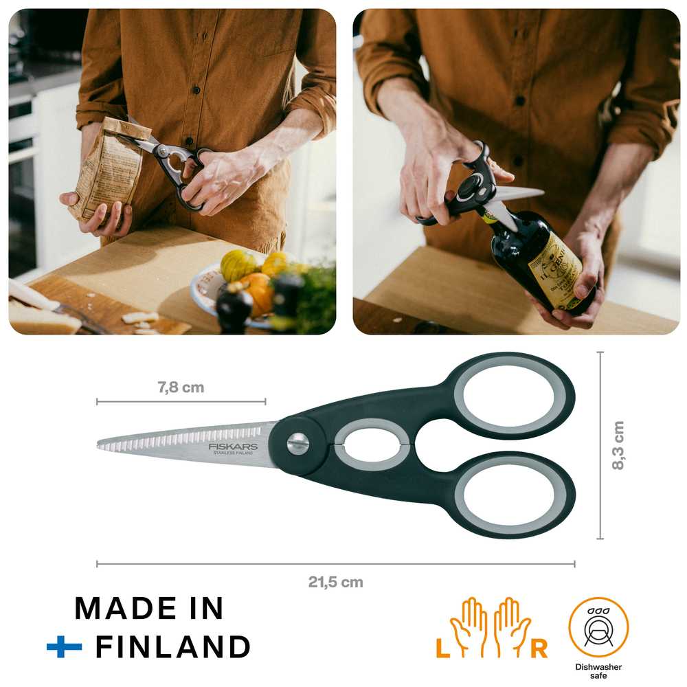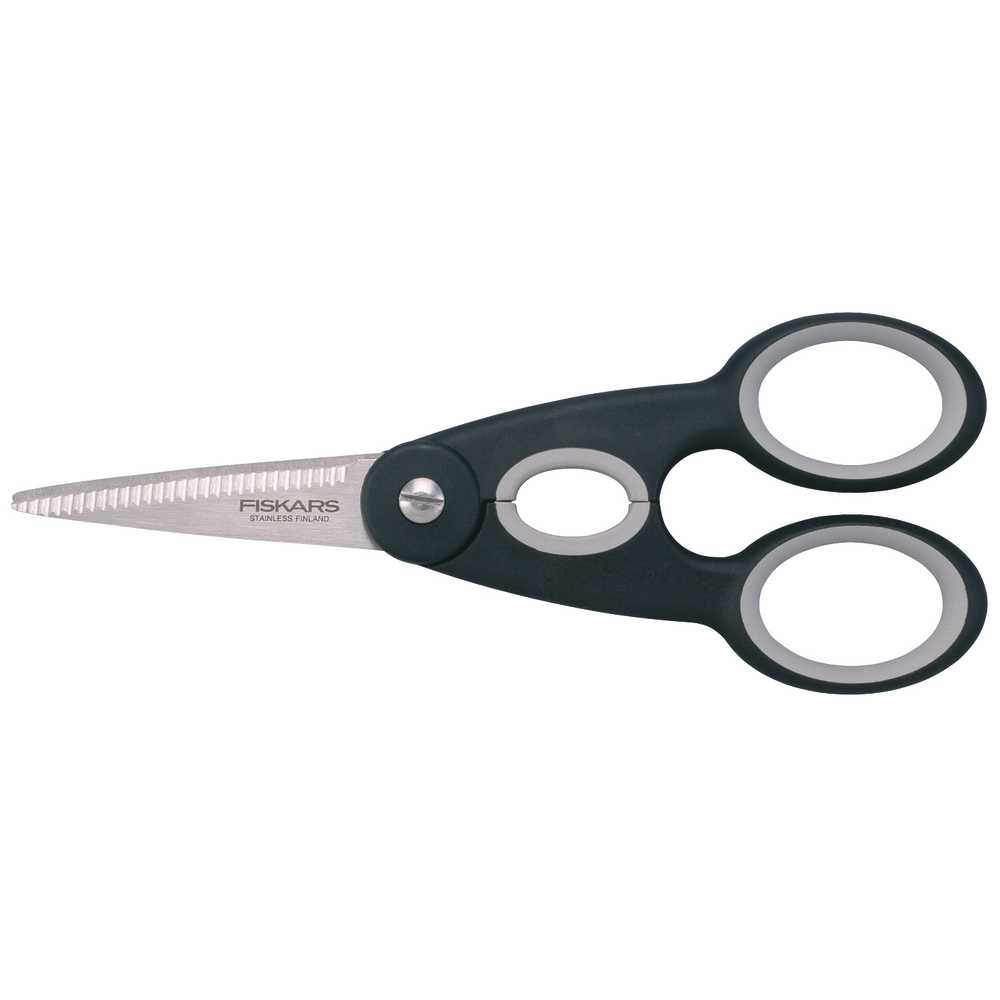 Кухонні ножиці Fiskars Functional Form™ (1003034) функціональні, міцні та сучасні. Їх широкі, міцні леза легко ріжуть папір та картон, а також пластик, упаковку та багато інших матеріалів на кухні та в побуті. Зубчасте нижнє лезо разом із регульованим натягом леза фіксує матеріал та полегшує різання. Ідеальне зчеплення забезпечується м'якими ручками Softouch®, які забезпечують додаткову безпеку завдяки ковзаючій поверхні. За допомогою овальних заглиблень між рукоятками можна легко відкрити щільно прилеглі гвинтові кришки (наприклад, пляшки з водою).
