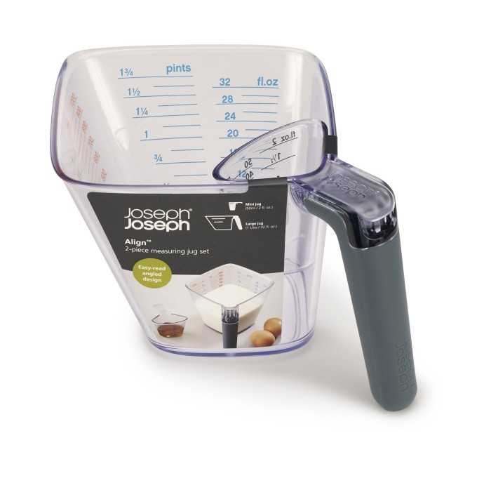 Набор мерных стаканов Joseph Joseph Align™ (40109) состоит из мерной чашки объемом 1 литр и встроенной мини-мерной чашки объемом до 50 мл, которую можно аккуратно и компактно закрепить в ручке большой чашки. Обе части имеют угловую форму для облегчения заливки. Кроме того, с мерным стаканом Align вам больше не нужно наклоняться, чтобы считывать единицы измерения при наполнении: единицы легко читаются и печатаются под углом, чтобы их можно было видеть сверху.