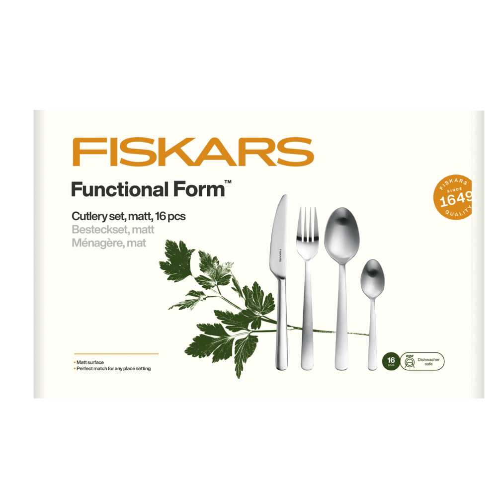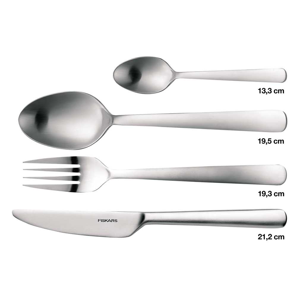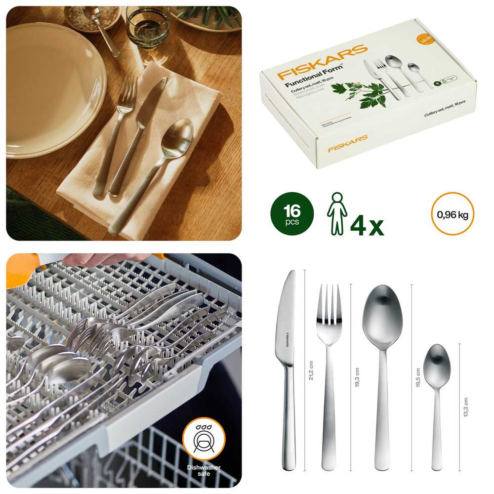 Набір столових приладів Fiskars Functional Form™ Matt 16 шт. (1002958) класичний, простий, але сучасний - це набір столових приладів Fiskars з функціональною формою з 16 предметів. Набір складається з чотирьох наборів по 4 предмети, кожен з яких складається зі столового ножа, вилки, столової ложки та чайної ложки. І з функціональності, і з дизайну всі деталі чудово доповнюють одна одну. Вигини ложок відбиваються в закруглених формах ножа та виделки, довгі вузькі ніжки надають гармонійної єдності та сучасного штриху. Простий дизайн, підкреслений матово-матовою поверхнею, робить набір столових приладів стильним супутником у повсякденному житті та в особливих випадках.