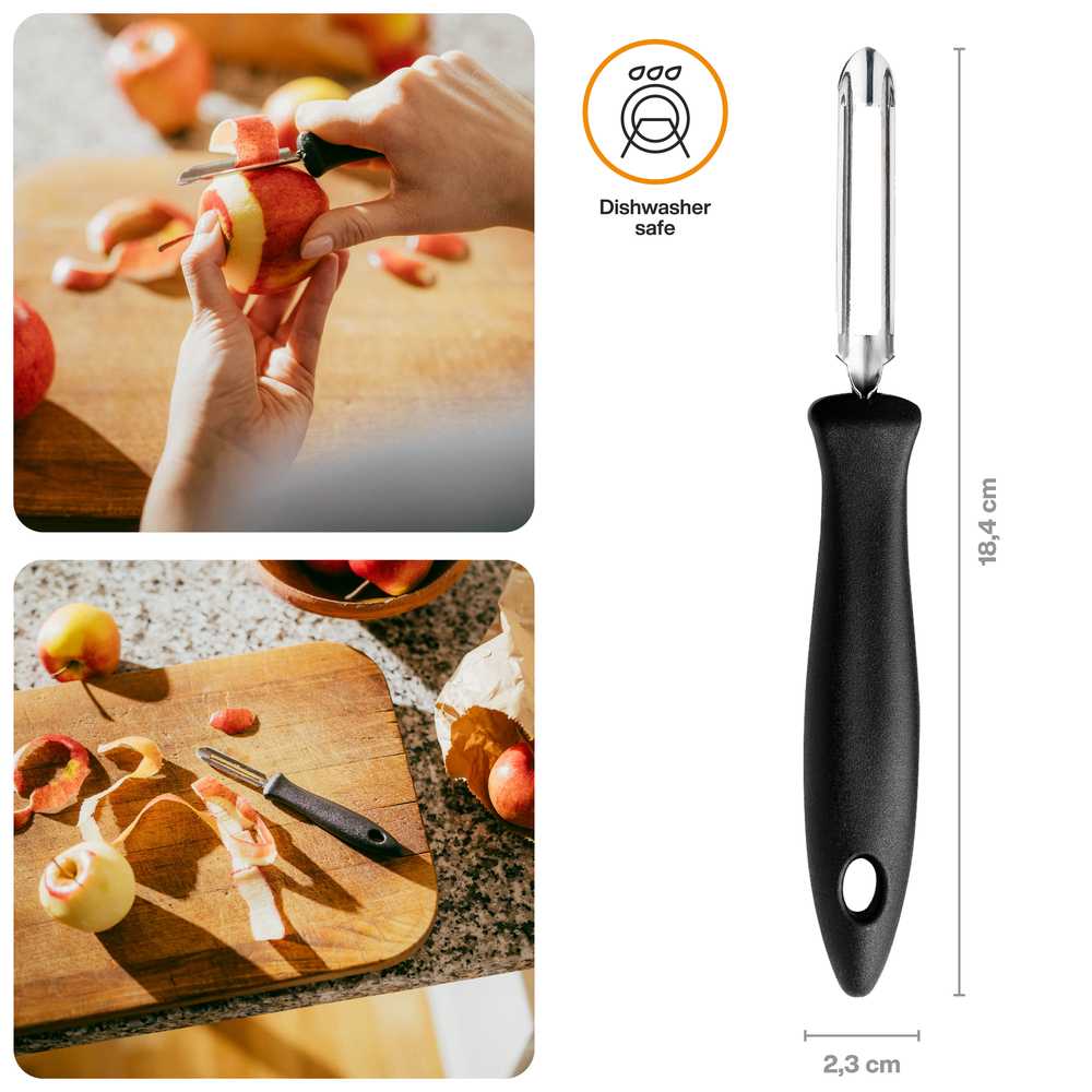 Овочечистка з рухомим лезом Fiskars Essential (1065586) є основним оснащенням будь-якої добре обладнаної кухні. Оснащена рухомим лезом з нержавіючої сталі, що дозволяє швидко та легко очищати фрукти та овочі завдяки великому вирізу в центрі леза. Закруглений наконечник запобігає травмам, а також вбудований захисний кожух на рукоятці ергономічної форми. Виготовлена з чорного пластику, що не ковзає, добре лежить в руці і забезпечує швидку, але безпечну роботу навіть протягом більш тривалого періоду. Легкий догляд ніж можна легко чистити під струменем води, а також миючим засобом або в посудомийній машині для більших або прилиплих забруднень.