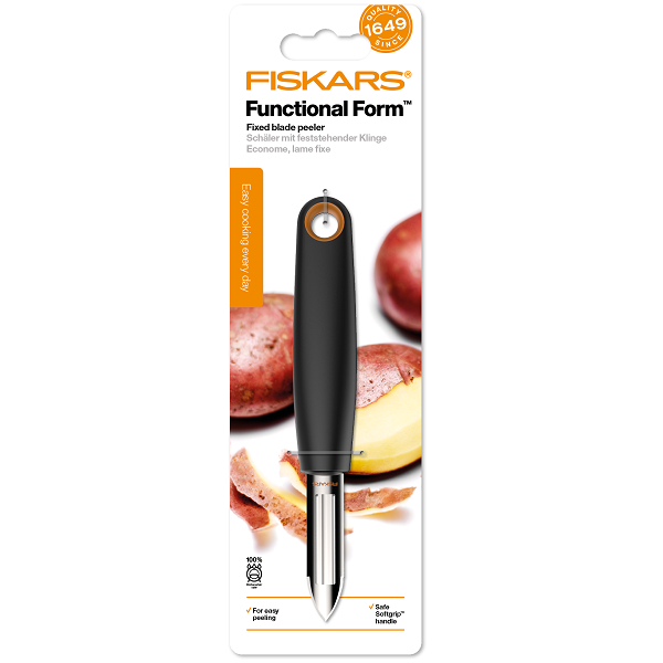 Овощечистка Fiskars Functional Form™ (1014418) с фиксированным лезвием для очистки овощей и фруктов. Рукоятка с покрытием Softgrip™. Наконечник можно использовать для удаления глазков.