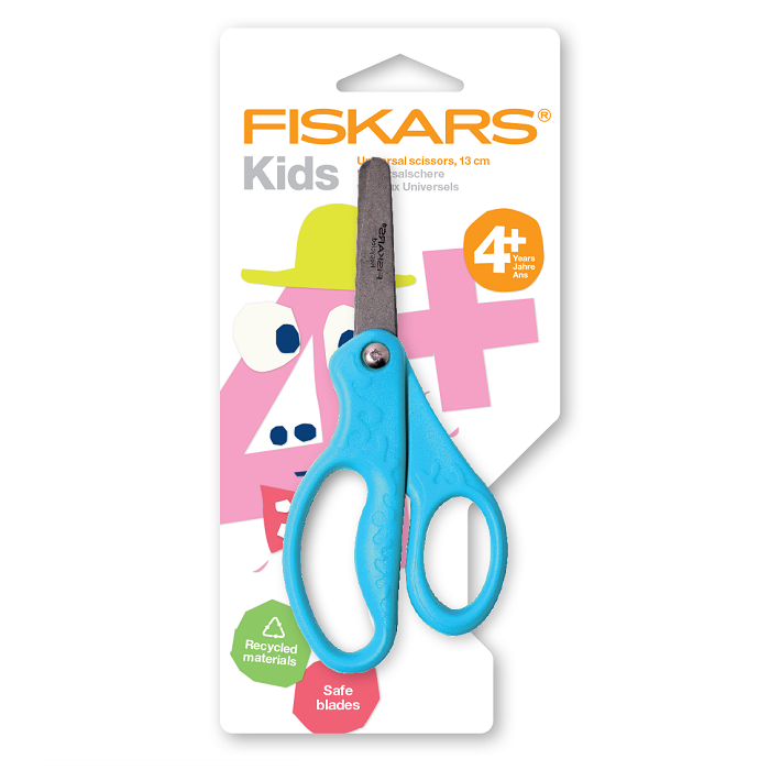 Детские ножницы Fiskars Kids recycled scissors 13cm (1003760). Ножницы изготовлены из полностью перерабатываемых материалов: ручки ножниц из на 100% перерабатываемого пластика; упаковка полностью перерабатывается (картонное основание и блистер). У ножниц безопасные закруглённые концы лезвий.