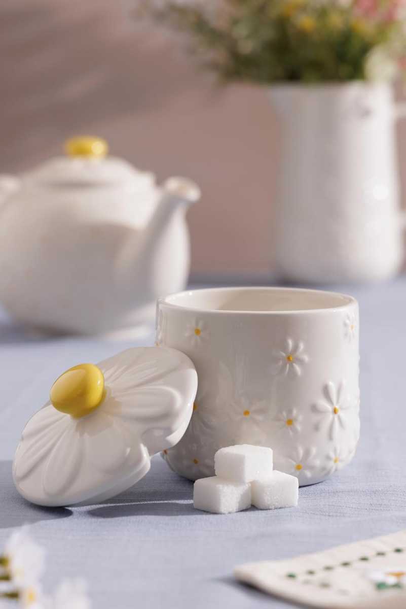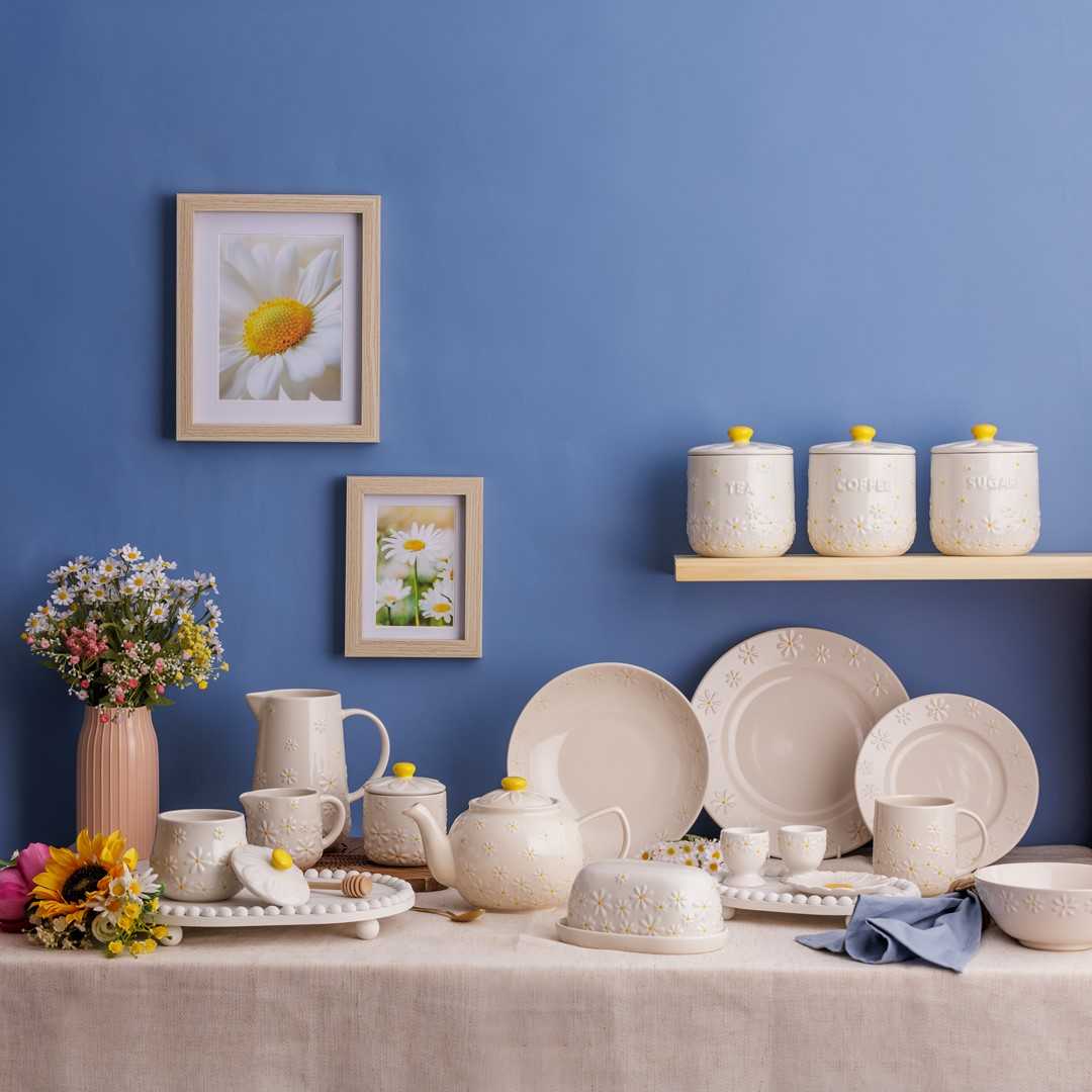 Коллекция Daisy включает в себя разнообразные кухонные изделия, украшенные узором ромашек и элементами ручной росписи.