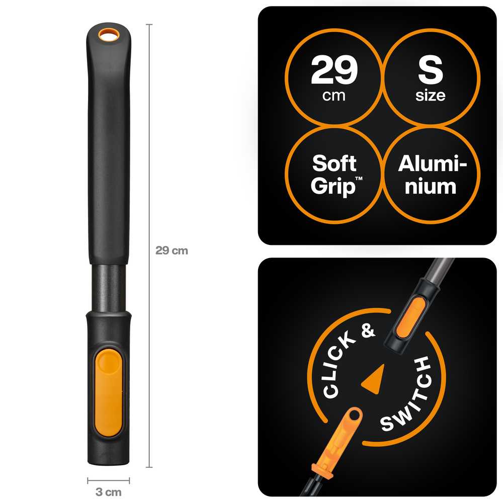 Черенок Fiskars OneClick S (1080548) для небольших садовых задач, где точность, комфорт и экономия места являются ключевыми. Эта компактная ручка является идеальным основанием в модульной системе OneClick и идеально подходит для точной работы в бордюрах, цветочных ящиках и небольших садах.