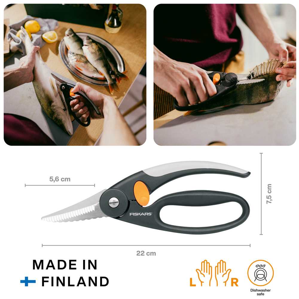 Ножницы для рыбы Fiskars Functional Form™ (1003032) сильные ножницы с зубцами для разделки рыбы, удобны для удаления чешуек, резки рыбы и плавников. Мягкие ручки ручки SoftgripTM с уменьшающей давление поверхностью Softouch® хорошо подходят как для правшей, так и для левшей. Ручка-петля для удобного использования. С блокировочным механизмом, управляемым большим пальцем. Регулируемое натяжение лезвия.