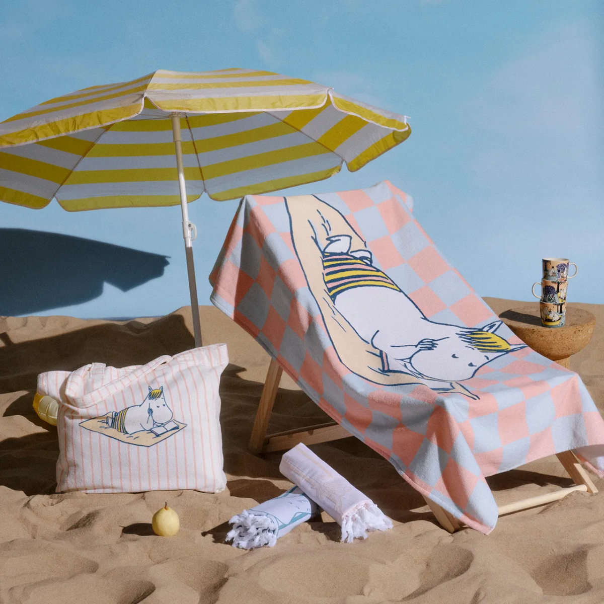Мумі-тролі проводять сонячний літній день на пляжі. Фрекен Снорк занурюється в книгу та насолоджується літнім теплом. Модні квадратики прикрашають пляжний рушник, який випромінює морську атмосферу. М'який органічний бавовняний велюр чудово відчувається на дотик.