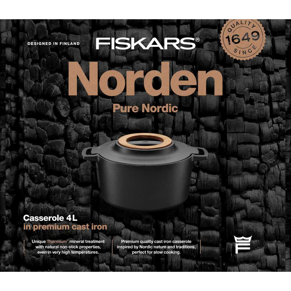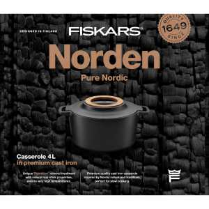 Чавунна каструля Fiskars Norden 4 L (1026565) виготовлена з інноваційного поєднання високоякісних матеріалів, що витримують дуже високі температури і мають чудові природні антипригарні властивості. Ідеально підходить для тушкованих страв, зберігаючи весь смак їжі. Чавунна каструля преміум-класу натхненна природою та скандинавськими традиціями. Унікальна мінеральна обробка Thermium™ на емальованій чавунній поверхні надає продукту чудових антипригарних властивостей навіть при дуже високих температурах. Знімна дерев'яна підставка із фінської берези.