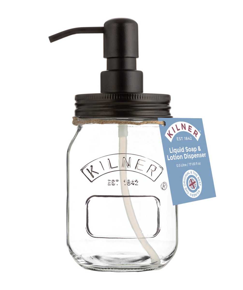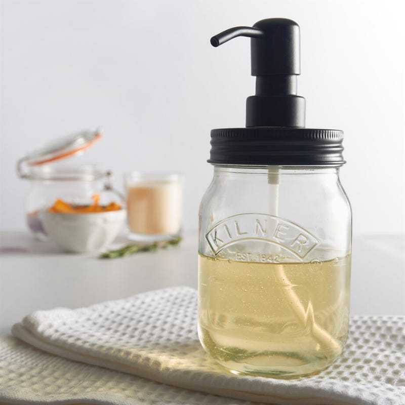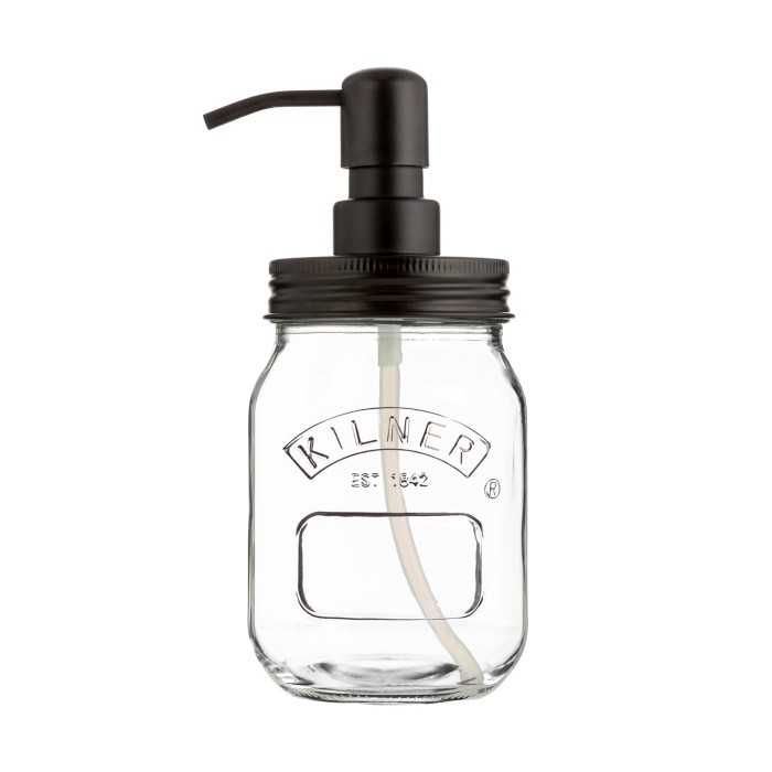 Диспенсер для рідкого мила або рідини Kilner 0,5L (0025.059) призначений для використання на кухні та у ванній кімнаті. Рідина легко розподіляється завдяки міцному механізму насоса з металевою пружиною. Місткість 500 мл ідеально підходить для розміщення поряд з раковиною та ідеально підходить для повторного наповнення рідким милом та лосьйоном, що знижує потребу в одноразових пластикових пляшках та контейнерах. Помповий механізм виготовлений із стійкої до іржі нержавіючої сталі 18/10 та покритий стильним чорним матовим покриттям.