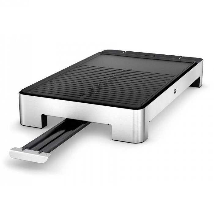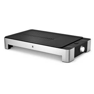Електричний настільний гриль WMF Lono (415340011) з майданчиком для барбекю (27 х 41 см) ідеально підходить для здорового, нежирного, смачного барбекю в домашніх умовах за будь-якої погоди. Виготовлений з матової нержавіючої сталі Cromargan а також оснащений алюмінієвою пластиною (27 x 41 см) з двома поверхнями - ребристою (2/3 від загальної кількості) та гладкою (1/3 від загальної кількості), з антипригарним покриттям, придатним для посудомийної машини та знімний сталевий піддон для залишків їжі.