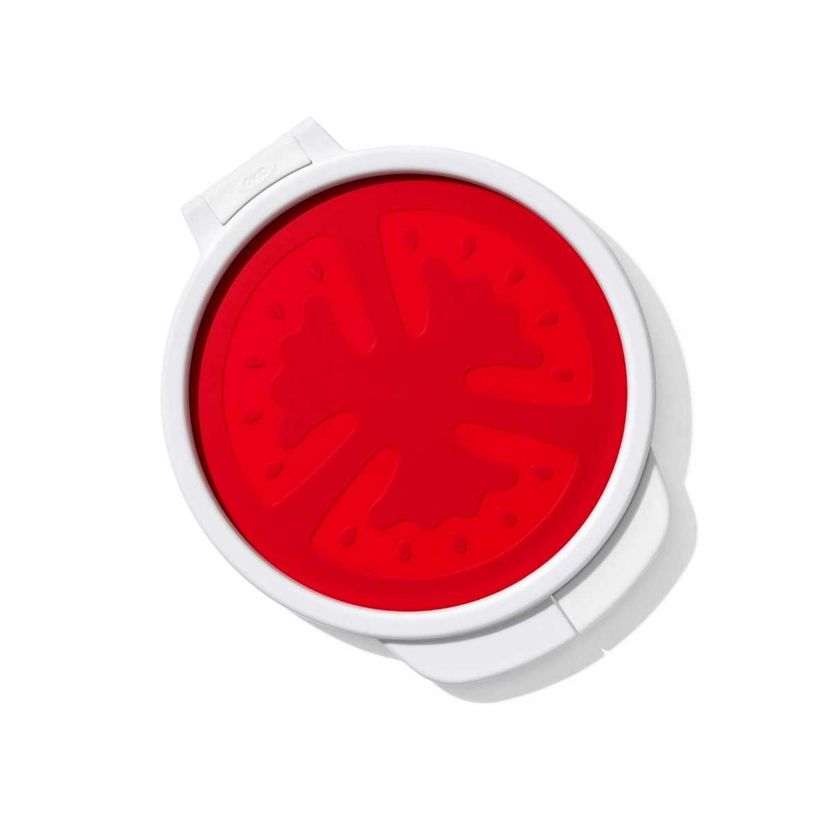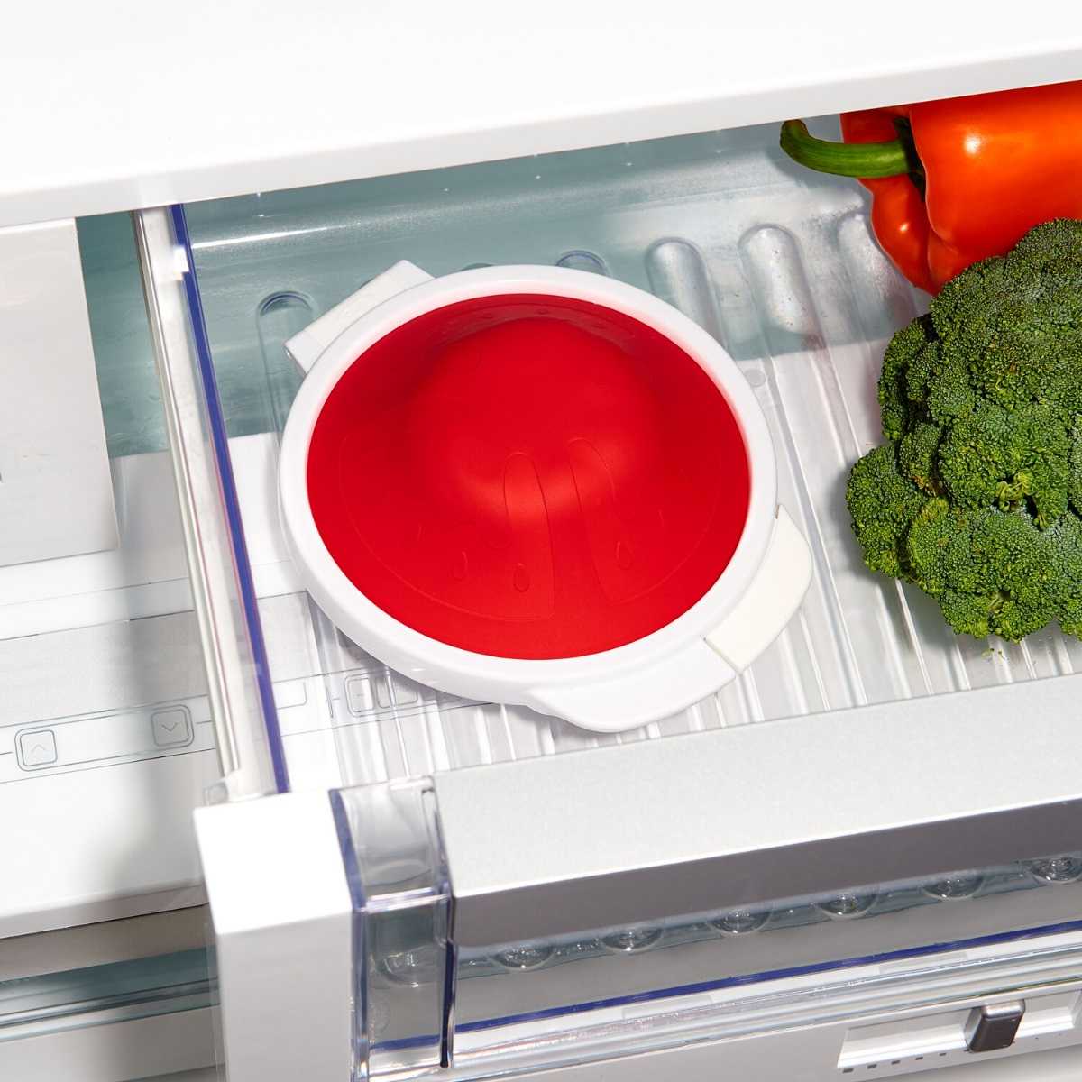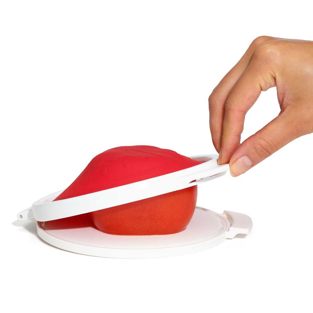 Емкость для хранения OXO для помидоров (11250000MLNYK) - самый простой способ хранить остатки помидоров в холодильнике. Благодаря гибкой мембране, натянутой на пластиковую основу, оболочка подходит для половинок помидоров меньшего и среднего размера. Плотное закрытие предотвращает попадание воздуха внутрь корпуса, поэтому продукты, хранящиеся в холодильнике, не впитывают запахи. Отсутствие доступа воздуха также влияет на более длительную свежесть овощей, замедляя процесс размножения бактерий и замедляя образование плесени. Интенсивный красный цвет оболочки делает ее хорошо видимой в холодильнике, а сам цвет относится к цвету помидора. Силиконовую мембрану можно снять для тщательной очистки. Сборка корпуса интуитивно проста: просто вставьте выпуклый силиконовый край в пластиковую основу. На внешней стороне контейнера должен быть виден выпуклый узор.