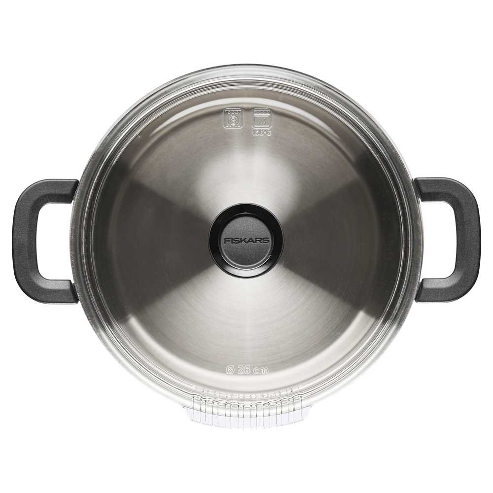 Каструля Fiskars Functional Form™ 7 л (1072318) ідеально підходить для приготування багатьох смачних повсякденних страв, особливо супів і тушкованих страв, а також для приготування великих страв або для приготування на водяній бані. Каструля об'ємом 7 л на 90 % виготовлена із міцної переробленої нержавіючої сталі та може використовуватися на всіх плитах, включаючи індукційні. Каструля оснащена внутрішнім індикатором рідини та скляною кришкою. Продумана конструкція, кришка з контролем кипіння та вбудоване сито, що дозволяє більш точно порціонувати. Кришка має простий дизайн ручки та функцію контролю кипіння, а плоска форма робить її дуже зручною для зберігання.