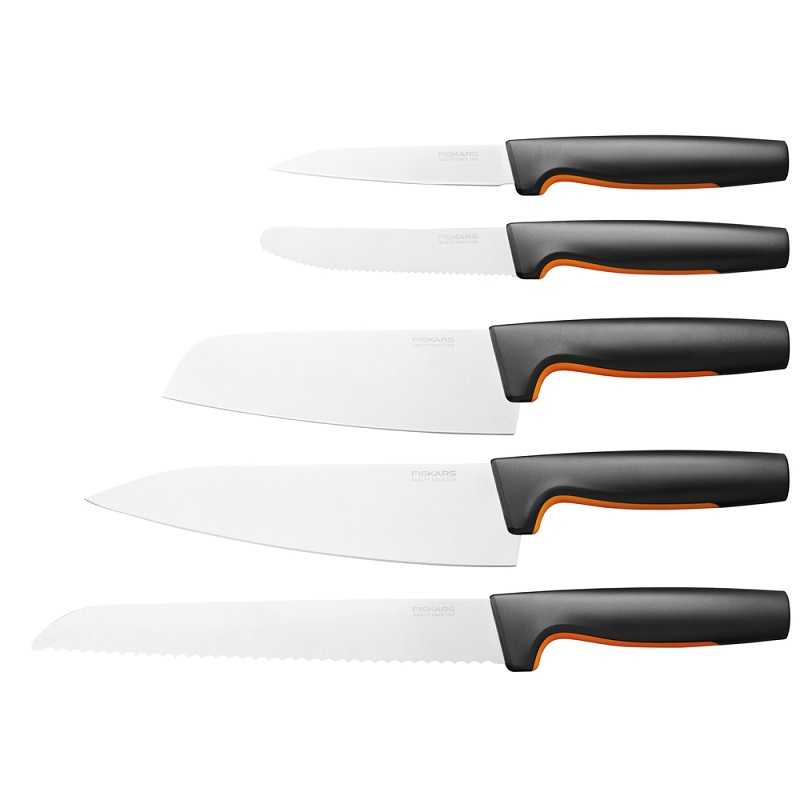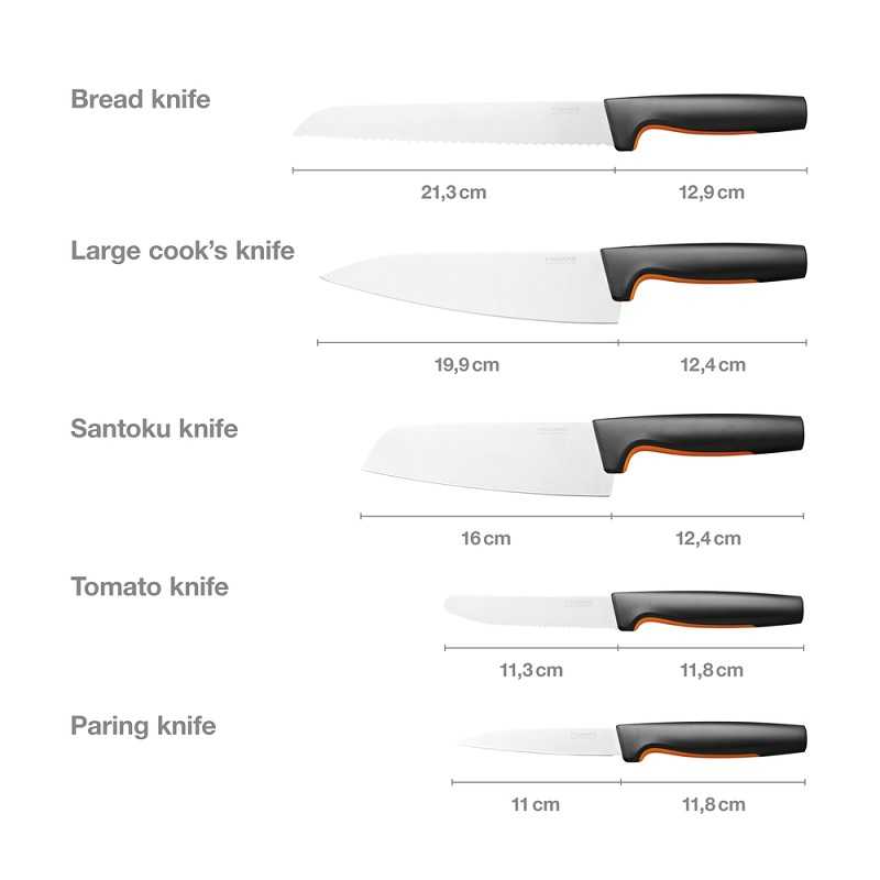 Набір ножів Fiskars Functional Form™ Large starter set (1057558) містить п'ять ножів, що найчастіше використовуються. Кожен ніж спроектований з урахуванням функціональності, комфорту та простоти використання. Вони мають міцні леза з японської нержавіючої сталі та ергономічні ручки. Великий кухарський ніж ідеально підходить для нарізки м'яса, шатківниці овочів, подрібнення зелені та багато іншого. Ніж для хліба та кондитерських виробів має довге зубчасте лезо та ідеально підходить для нарізки тіста з твердою скоринкою. Ніж Сантоку має широке лезо та ідеально підходить для приготування м'яса, риби та овочів. Ніж для очищення овочів ідеально підходить для нарізування фруктів та овочів. Ніж для сніданку має лезо з дрібними зубцями, яке ідеально підходить для нарізування фруктів та овочів разом із шкіркою. Рукоятки ножів мають поверхню SoftGrip™ та глибокі огорожі для пальців, що забезпечують безпечне та зручне захоплення. Як і всі ножі Functional Form™, ці ножі можна мити у посудомийній машині для щоденного миття.