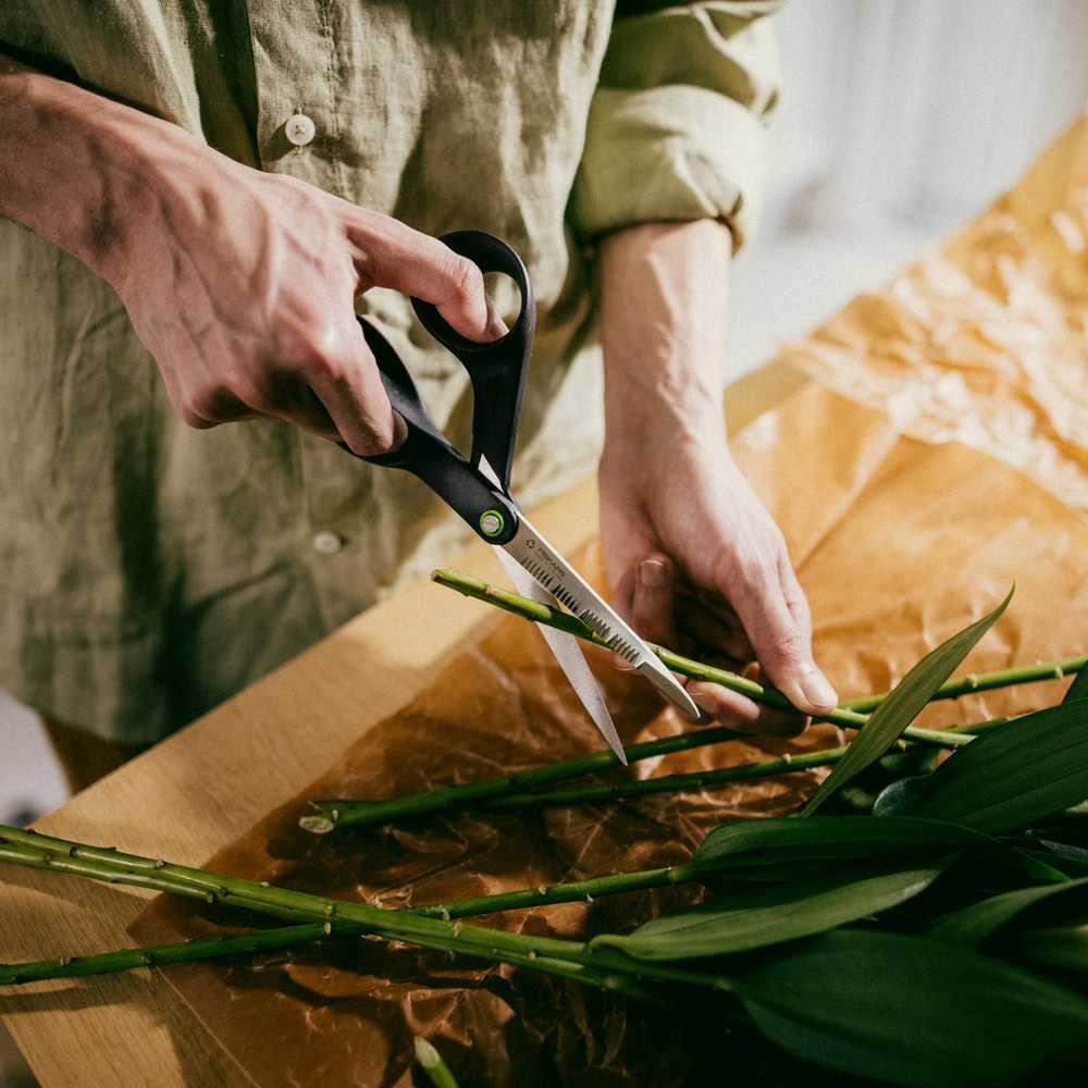 Садові ножиці Fiskars Functional Form™ ReNew 21см (1074544) ідеально підходять для обрізання квітів та трав. Вони виготовлені із перероблених матеріалів (мінімум 70%). Міцні високоякісні леза з переробленої нержавіючої сталі оснащені канавками для захоплення стебел, забезпечуючи чистий та ефективний зріз. Ергономічні ручки з переробленого пластику, армованого скловолокном, забезпечують винятковий комфорт та дуже зручне захоплення. Дана модель виробляється на заводі у Фінляндії та сертифікована на відповідність екологічним стандартам.