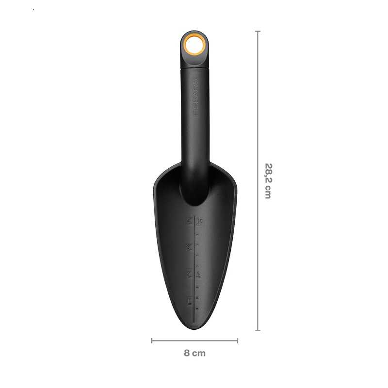 Садовий совок Fiskars Solid™ (1071899) ідеальний для посадки та пересадки в квіткові горщики та на грядки. Дуже міцний пластик, що на 65 % складається з переробленого пластику зі скловолокном. Пластик стійкий до УФ-випромінювання. Отвір для підвішування для зручного зберігання.