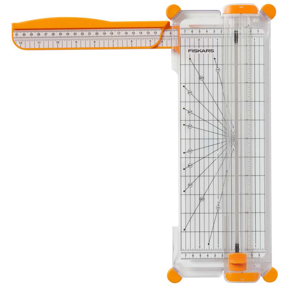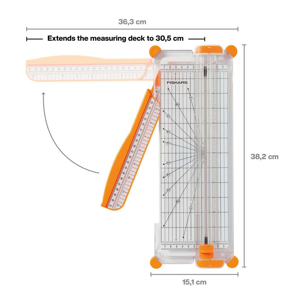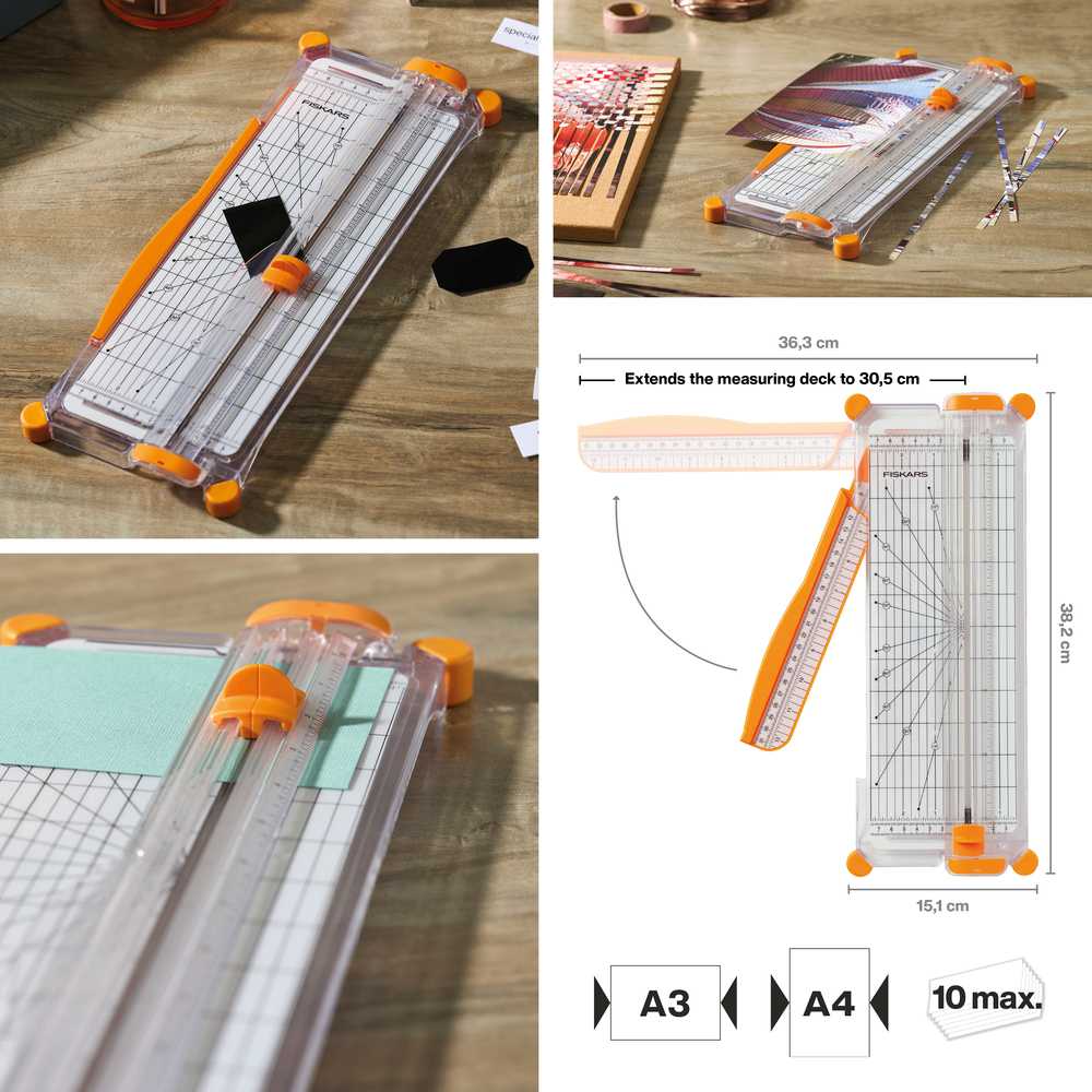 Різак для паперу Fiskars SureCut - А4 (1077799) з вузькою основою оснащений міцним і стійким до стирання дротом SureCut™ з нержавіючої сталі, який точно показує, де буде різати лезо, а запатентована система TripleTrack™ фіксує лезо і направляючу розрізу та забезпечуючи. Ергономічні особливості включають високопрофільну, зручну для захоплення каретку леза і компактну, легку і зручну для перенесення конструкцію. Опорна плита різака оснащена поворотним важелем, що самовирівнюється, який подовжує плиту до 30,5 см, що дозволяє ідеально справлятися з більшими проектами. Постійна сітка також забезпечує точність вимірювань, а подовжувальна ріжуча рейка із захистом від плям та гумовими ніжками допомагає утримувати матеріали на місці та захищати ваше робоче місце.
