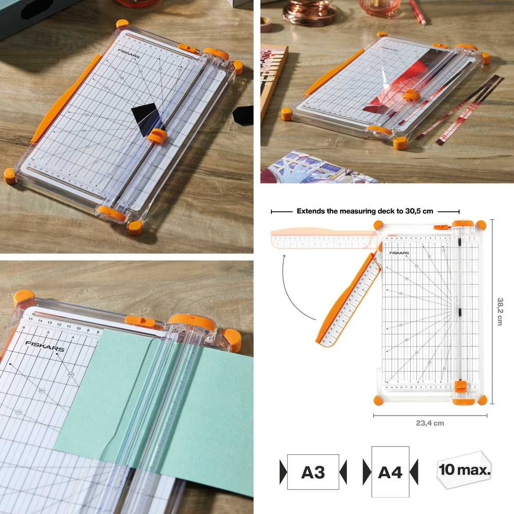 Різак для паперу Fiskars SureCut - А4 (1077980) оснащений міцним і стійким до стирання дротом SureCut™ з нержавіючої сталі, який точно показує, де різатиме лезо, а запатентована система TripleTrack™ фіксує лезо і направляючу разом, забезпечуючи кожен разровие. Ергономічні особливості включають високопрофільну, зручну для захоплення каретку леза і компактну, легку і зручну для перенесення конструкцію. Опорна плита різака оснащена поворотним важелем, що самовирівнюється, який подовжує плиту до 38 см, що дозволяє ідеально справлятися з більшими проектами. Постійна сітка також забезпечує точність вимірювань, а подовжувальна ріжуча рейка із захистом від плям та гумовими ніжками допомагає утримувати матеріали на місці та захищати ваше робоче місце.