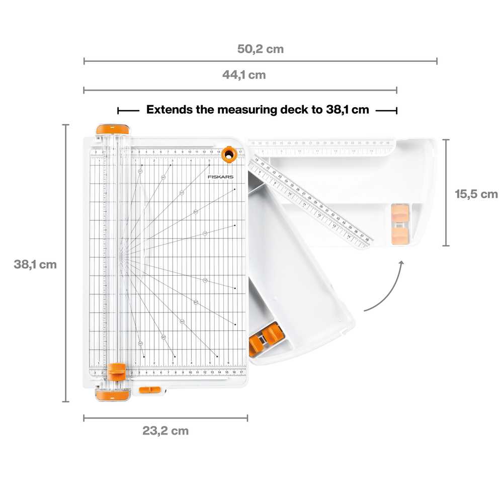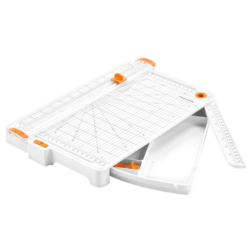 Різак для паперу Fiskars SureCut - А4 (1077981) з відсіком для зберігання. Оснащений міцним на розрив та стирання дротом із нержавіючої сталі SureCut™, який точно вказує, де різатиме лезо, а запатентована система TripleTrack™ з'єднує лезо та направляючу для отримання прямих та точних розрізів щоразу. Розкішний дизайн різака включає вбудований відсік для зберігання, тож ви можете тримати матеріали для проекту під рукою. Ідеально підходить для робочих середовищ з обмеженим простором та функціональною організацією. Ергономічні особливості включають зручний для захоплення, високопрофільний тримач лез і зручну для транспортування, легку і компактну конструкцію. Базова дека цього різака шириною 16 см і поворотний важіль, що саморегулюється, що подовжує деку до 38,7 см, ідеально підходять для точного різання великих проектів. Крім того, постійна сітка забезпечує точність вимірювань, а подовжена ріжуча рейка із захисним кожухом та гумовими ніжками допомагає утримувати матеріали на місці та захищати ваш робочий простір.