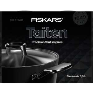 Кухонний посуд Fiskars Taiten – це інновація, що розвиває уяву та пропонує повний контроль над кожним моментом вашої творчої роботи. Каструля Taiten з кришкою об'ємом 3,5 л виготовлена із 100% переробленого високоякісного алюмінію, який дуже добре проводить тепло та нагріває їжу не лише знизу, а й з боків каструлі. Антипригарна поверхня Ceratec™, що не містить пластику, надає каструлі відмінних антипригарних властивостей.