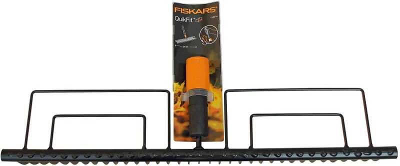 Граблі для газону Fiskars QuikFit™ (1000656) - це широкі граблі для збирання листя та різних відходів з газонів. Граблі для газону Fiskars QuikFit™ ефективно видаляють сміття затверділими вуглецевими сталевими зубцями і гарантують, що ваше подвір'я бездоганне. Як і інші головки QuikFit, ця головка інструмента може використовуватися з усіма стандартними та малими ручками Fiskars QuikFit™.