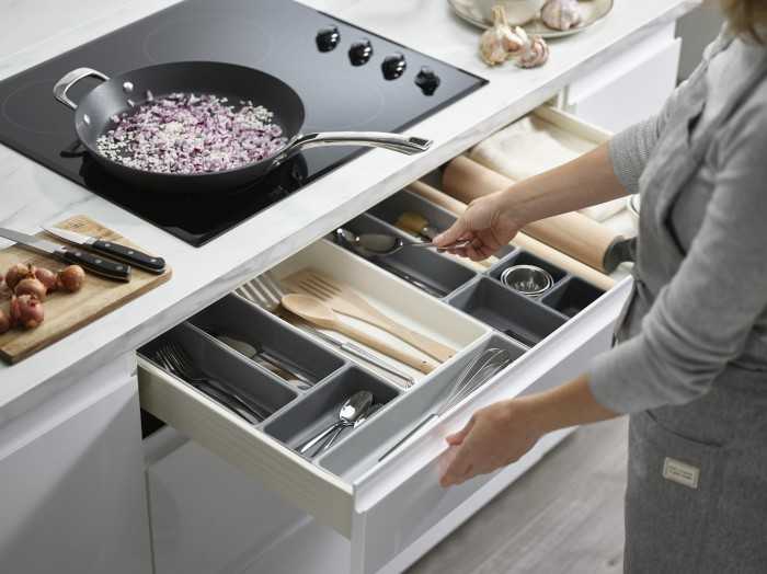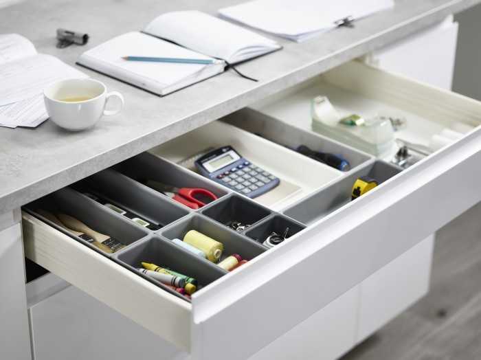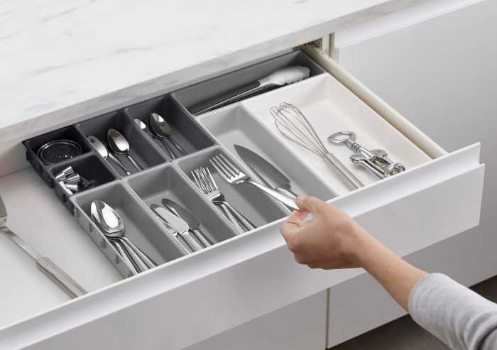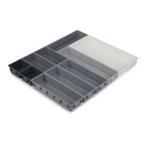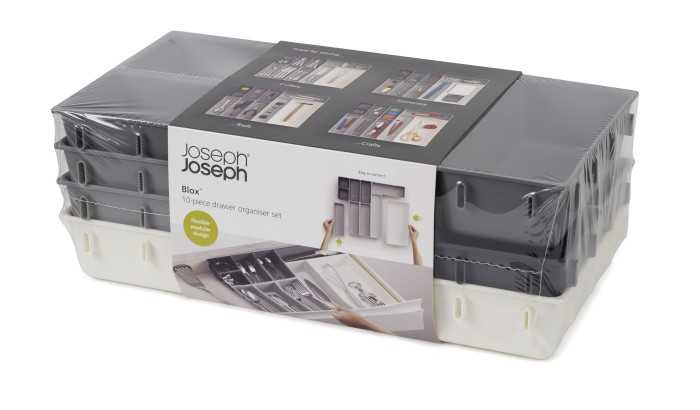 Модульний органайзер Joseph Joseph Blox™ (85200) з 10 елементів різного розміру, які можна вільно роз'єднувати та комбінувати між собою, що дозволить адаптувати їх до місця в ящику. У комплект входять нековзні ніжки, що самоклеяться, які захистять від надмірного ковзання органайзера при висуванні і закриванні ящика. Виріб гігієнічний і легко миється - досить протерти вологою ганчіркою. Він був виготовлений із пластику різних відтінків сірого. Його можна використовувати окремо або у поєднанні з іншим органайзером Joseph Joseph Blox.