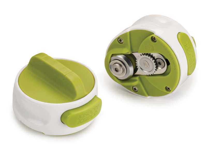 Консервний ніж Joseph Joseph CanDo (20005) компактний ніж, виготовлений з білого та зеленого пластику. Яким можна швидко та легко відкривати кожну консервну банку. Він має велику ручку – просто поверніть її так, щоб ніж леза відкрив банку. Натискання на передню кнопку звільняє кришку. Безпечний – кришки відкритих банок не мають зубчастих кромок. Легко зберігати у ящиках.