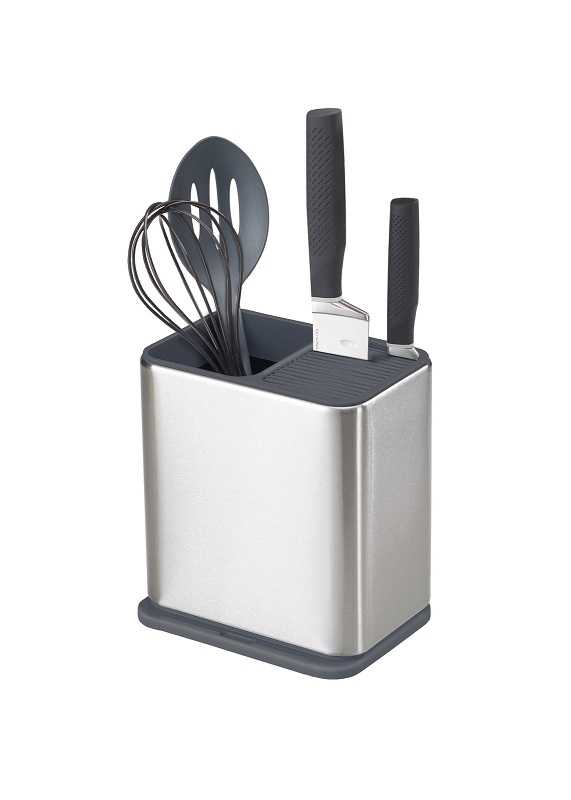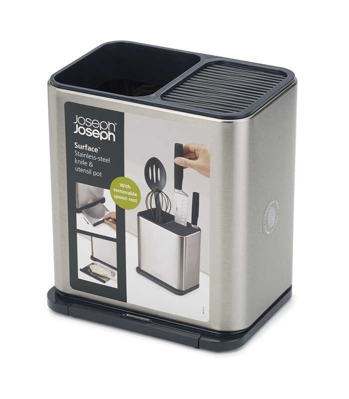 Контейнер для кухонного приладдя Joseph Joseph Surface™ (85114), простий, функціональний та надзвичайно елегантний контейнер для кухонного приладдя, виготовлений із нержавіючої сталі SS430, стійкою до відбитків пальців. Контейнер розділений на два простори (один для зберігання різних видів кухонного приладдя, інший спеціально профільований - для безпечного зберігання ножів), він має висувну підставку, яку можна використовувати для зберігання, наприклад, ложки під час приготування їжі.