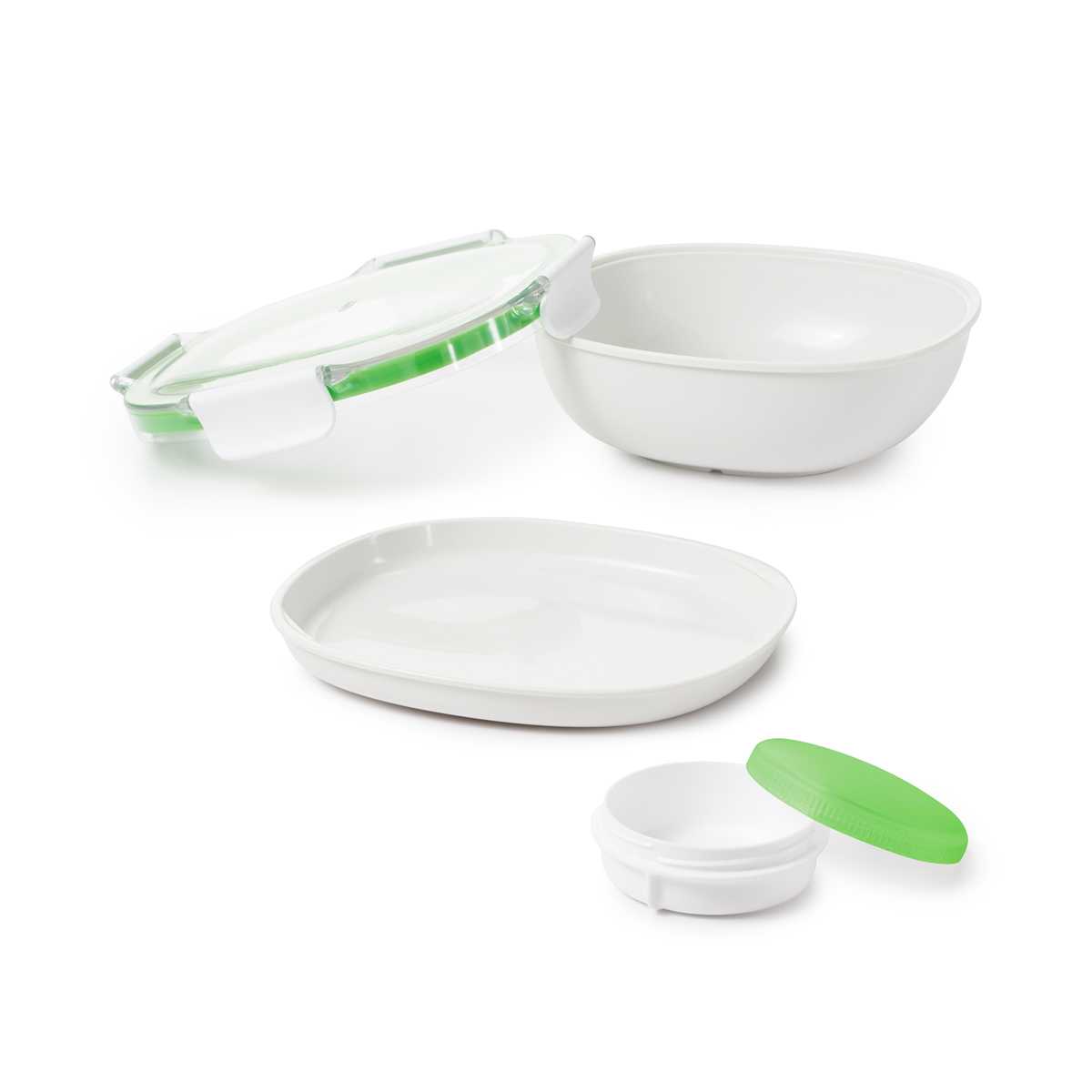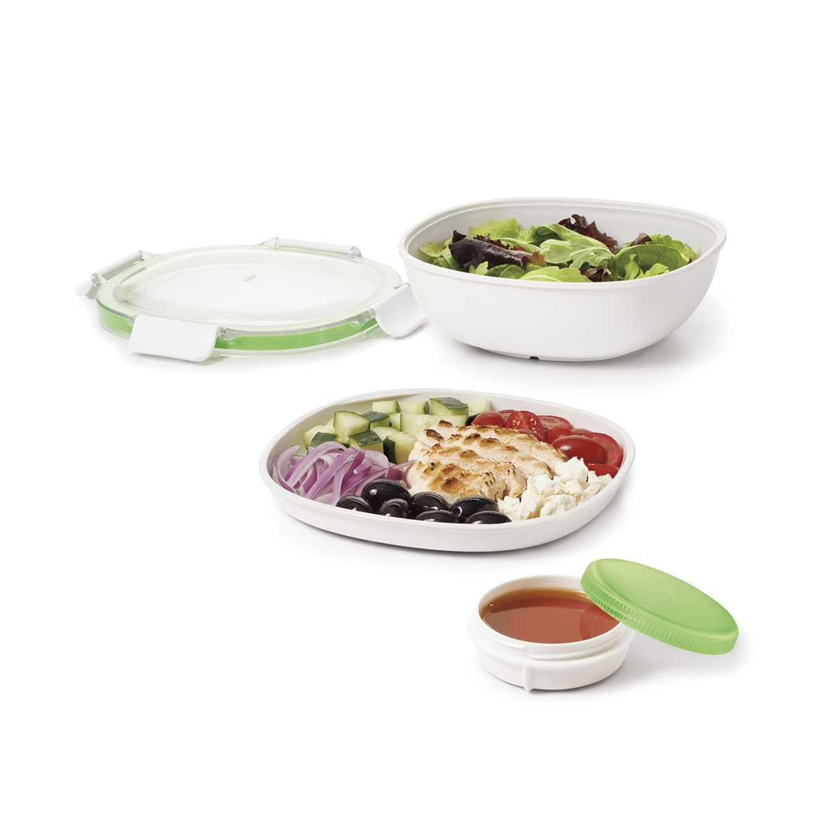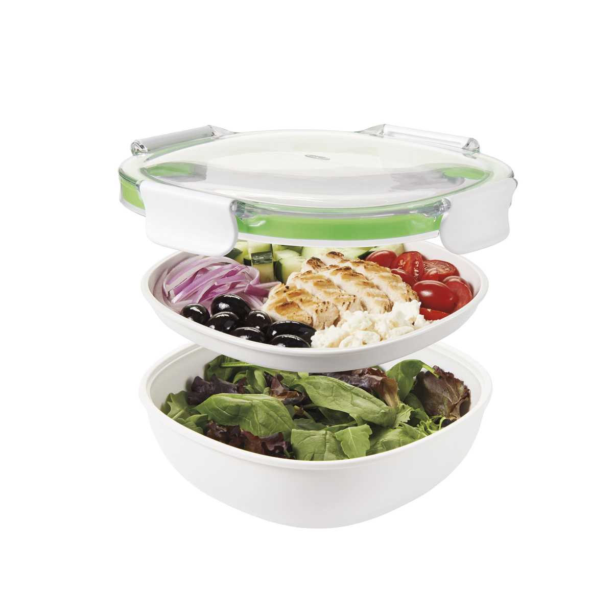 Контейнер Oxo Good Grips 1,31 L (11139700MLNYK) подойдет к большой порции салата с такими добавками, как мясо, оливки, помидоры, которые можно комбинировать с салатом непосредственно перед употреблением. Разделив емкость на два блюда, салат будет свежим и сохранит свою хрусткость. Кристально прозрачная крышка из прочного тритана имеет четыре фиксирующих крючка, обеспечивающих герметичность контейнера. Блюдо изготовлено из материала, который не вступает в реакцию с пищей, не влияет на вкус пищи и отличается исключительной устойчивостью к ударам и поломке. Оснащен силиконовой прокладкой, которую легко снять для очистки.