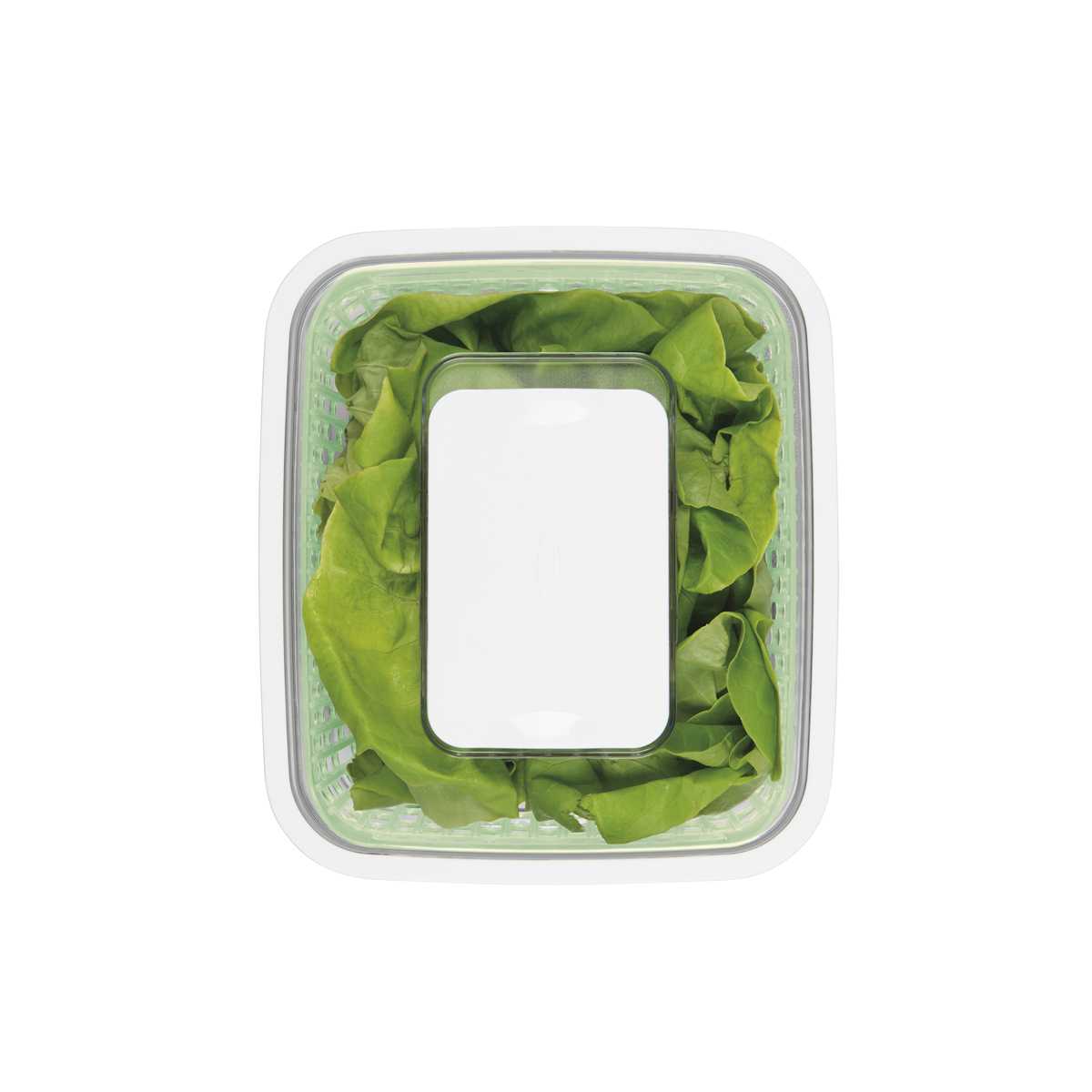 Рослини виробляють етилен - газ, що прискорює дозрівання, а потім і псування овочів та фруктів. Контейнери GREENSAVER оснащені фільтром з активованим вугіллям, виготовленим із шкаралупи кокосових горіхів з додаванням перманганату калію, які поглинають етилен та знезаражують, значно подовжуючи свіжість продуктів, що зберігаються. Зелений кошик на спеціальних ніжках запобігає контакту продуктів, що зберігаються, зі стінками контейнера, що забезпечує циркуляцію повітря і запобігає осіданню вологи на продуктах (уповільнюючи процес гниття рослин). Кошик також може використовуватися як друшляк. Кожен контейнер GREENSAVER має регульований вентиляційний отвір, який дозволяє підтримувати оптимальний рівень вологості для овочів і фруктів, що зберігаються (рекомендації щодо рекомендованої вологості повітря для різних видів рослин можна знайти в нижній частині вентиляційного отвору). У комплект входить один вугільний фільтр із терміном служби 90 днів. Індикатор на корпусі нагадує необхідність заміни фільтра (повзунок дозволяє відзначити місяць, в якому фільтр був встановлений).