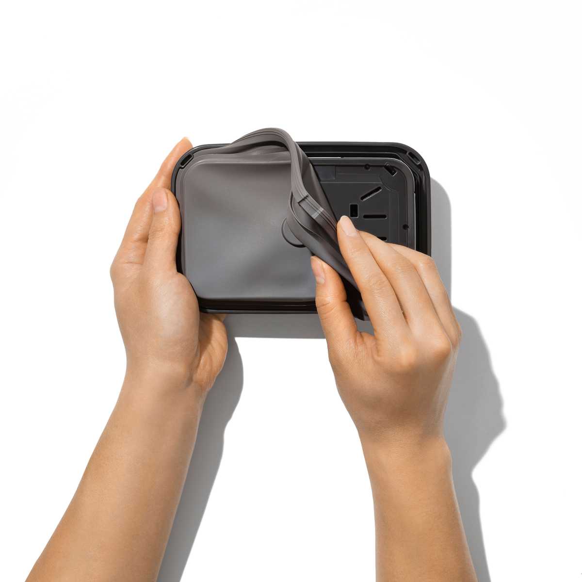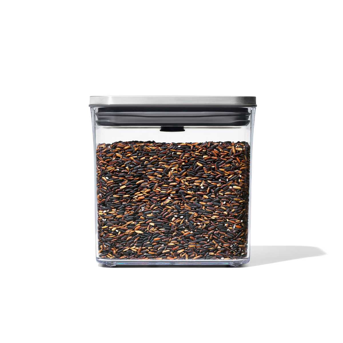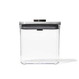 Контейнер Oxo Steel 1,6 L (OX3118800) призначений для зберігання сипучих та сухих продуктів. На боці ємності є лінія, що вказує на максимальний рівень заповнення. Місткість об'ємом 1 л вміщує близько 0,5 кг цукру. Кришка ємності виготовлена з нержавіючої сталі та оснащена кнопковим механізмом. При натисканні кнопки на кришці утворюється герметичне ущільнення ємності; при повторному натисканні кнопки ємність відкривається, і кришку також можна зняти. Завдяки цьому рішенню достатньо однієї руки, щоб відкривати та закривати ємність. Внизу кришки є місце, куди можна прикріпити аксесуари, такі як мірні склянки чи мірні ложки. Ємності цієї серії можна комбінувати за модульним принципом, завдяки чому зберігання продуктів добре організоване, а на полицях все це виглядає дуже ефектно.