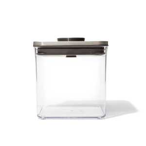 Контейнер Oxo Steel 2,6 L (OX3118300) призначений для зберігання сипучих та сухих продуктів. На боці ємності є лінія, що вказує на максимальний рівень заповнення. Місткість об'ємом 1 л вміщує близько 0,5 кг цукру. Кришка ємності виготовлена з нержавіючої сталі та оснащена кнопковим механізмом. При натисканні кнопки на кришці утворюється герметичне ущільнення ємності; при повторному натисканні кнопки ємність відкривається, і кришку також можна зняти. Завдяки цьому рішенню достатньо однієї руки, щоб відкривати та закривати ємність. Внизу кришки є місце, куди можна прикріпити аксесуари, такі як мірні склянки чи мірні ложки. Ємності цієї серії можна комбінувати за модульним принципом, завдяки чому зберігання продуктів добре організоване, а на полицях все це виглядає дуже ефектно.
