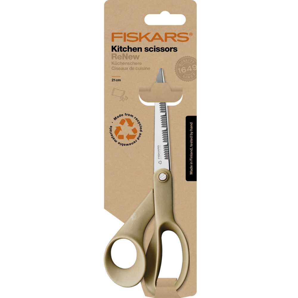 Кухонні ножиці Fiskars ReNew 21 cm (1062543) є екологічно чистими, розумним вибором для різання обгорток, трав та багато іншого. Вони на 80% виготовлені із перероблених матеріалів та на 100% придатні для вторинної переробки. Міцне зубчасте лезо забезпечує чистий зріз трав. Ергономічні кільця виготовлені з переробленого пластику та поновлюваної целюлози для забезпечення виняткового комфорту та контролю.