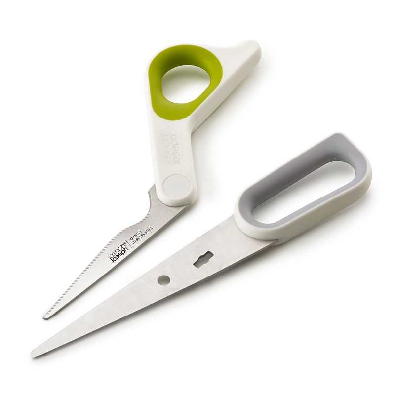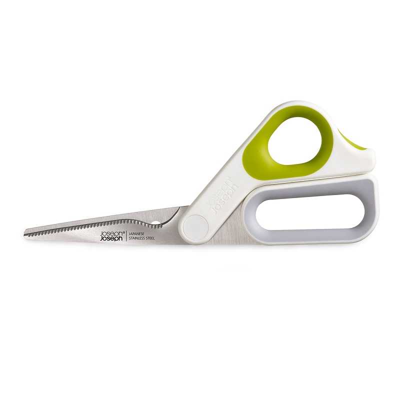 Ножиці Joseph Joseph PowerGrip™ (10302) ідеально підходять для різання та приготування їжі на кухні. Завдяки вбудованій рукоятці для великого пальця ножиці також можна використовувати обома руками, що означає, що можна використовувати більше зусилля. Ножиці ідеально підходять для розрізання курячих кісток чи дерев'яних шпажок. Леза з японської нержавіючої сталі із зубчастим краєм міцні та забезпечують хорошу продуктивність різання. Насікання для зрізання квіткових стебел і підставка для трави - практичні деталі ножиць. Леза ножиць можна розібрати для полегшення очищення.