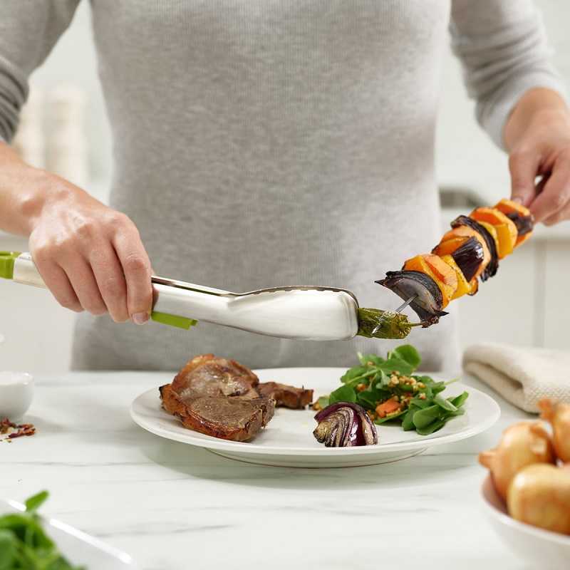 Кухонні щипці Joseph Joseph Elevate Steel (10536) підходять для різних процесів приготування на кухні і є відмінним помічником при обслуговуванні. Завдяки високоточному наконечнику навіть найдрібніші компоненти можна безпечно розмістити на тарілці, а наконечники у формі чаші також можна використовувати для соусу. Коли щипці з нержавіючої сталі не використовуються, їх можна покласти на вбудовану опору, щоб вони не торкалися робочої поверхні.