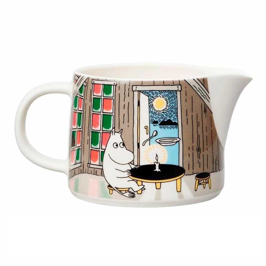 Глечик Arabia Moomin Moment of Twilight 0,35 L (1055266) проілюстрований сценою з книги Туве Янссон «Мумі-троль у середині зими», в якій решта сім'ї Мумі-тролів міцно спить, але Мумі-троль і Маленький Мій прокинулися від сплячки. На ілюстрації зі глечиком вони двоє потрапили до сімейної лазні, де взимку живе їх друг Ту-тікі. Занадто тиккі подають їм рибне рагу за допомогою невидимих землерийок. Місткість 3,5 дл робить глечик ідеальним для подачі молока, вершків, а також шоколаду або ванільного соусу.