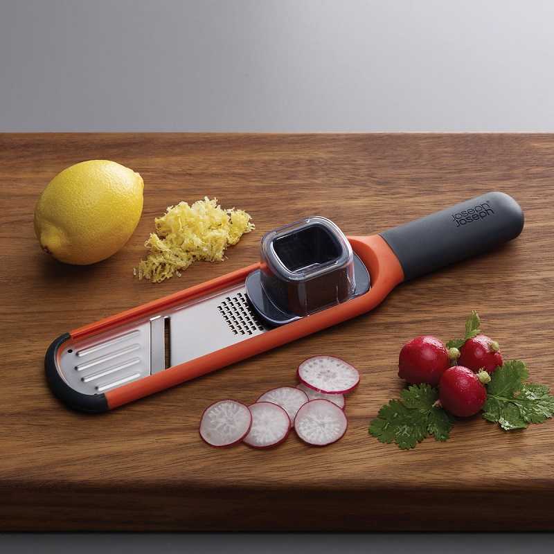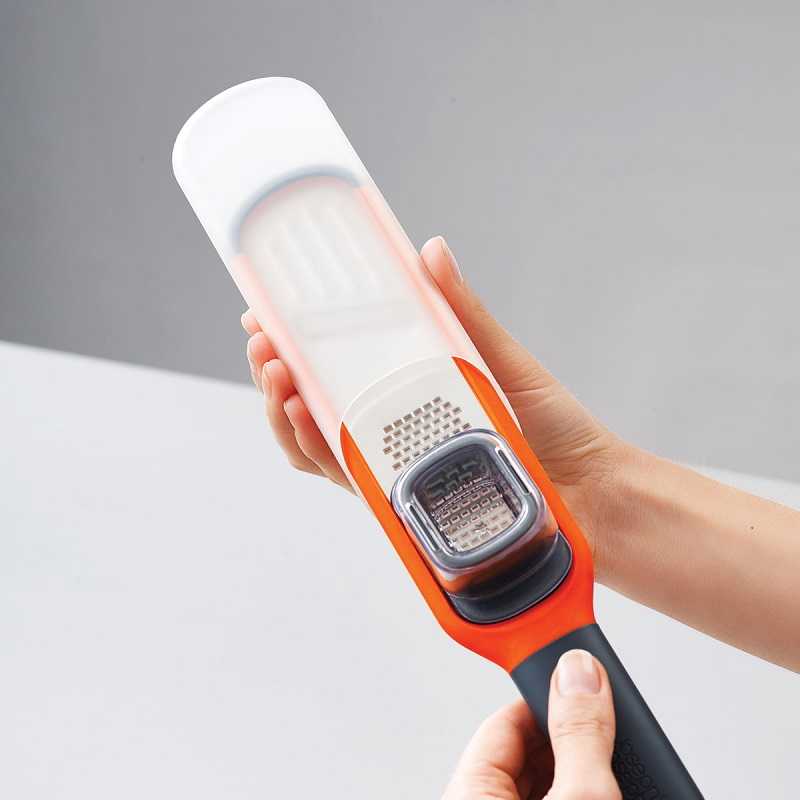 Міні-терка 2-в-1 Joseph Joseph Handi-Grate™ (20048) ідеально підходить для терки та нарізування невеликих продуктів, таких як часник, імбир та редис. Handi-Grate має ергономічну ручку, нековзний наконечник та рухливий захист для пальців при струганні та поставляється із захисним чохлом для безпечного зберігання. Handi-Grate виконує функцію стругальної терки, але становить лише невелику частину її розміру, що означає, що її можна зберігати в кухонному ящику для економії місця. Вона виготовлена з нержавіючої сталі та пластику без бісфенолу А. Кухонну терку Joseph Joseph можна мити в посудомийній машині.