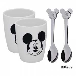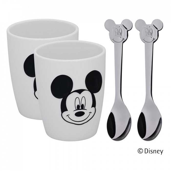 Набор детских кружек и ложек WMF Mickey Mouse (12.9644.6042) - 4 предмета, в подарочной коробке. Ложки изготовлены из полированной нержавеющей стали 18/10 Cromargan®, устойчивой к царапинам Cromargan® и органическим кислотам, а кружки - из высококачественного фарфора. Ложки украшены формой головы Микки Мауса на конце ручки.