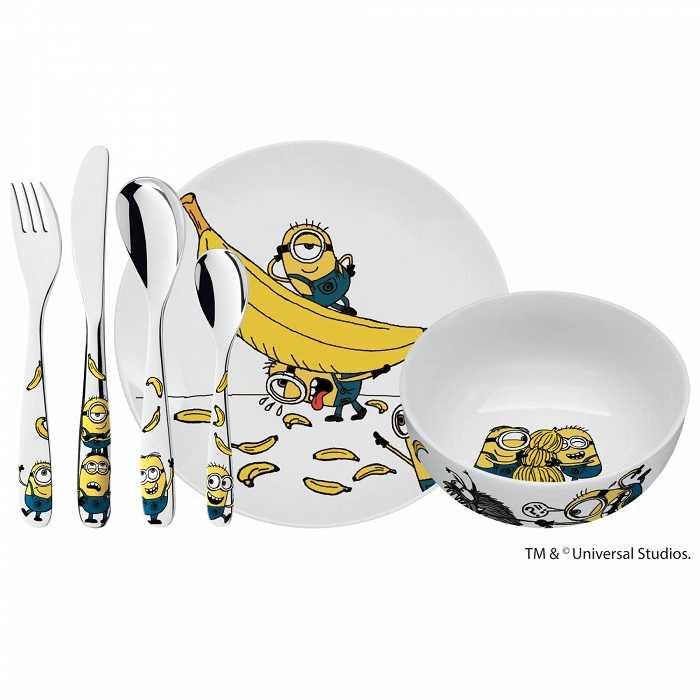 Набор детской посуды WMF Minions 6 предметов (1286079964) состоит из тарелки, чаши и столовых приборов: ножа, вилки, ложки, чайной ложки. Посуда изготовлена из фарфора, столовые приборы из полированной нержавеющей стали 18/10 Cromargan®, устойчивой к царапинам и органическим кислотам. Набор украшен персонажами Minions - поощряет детей, к еде.
