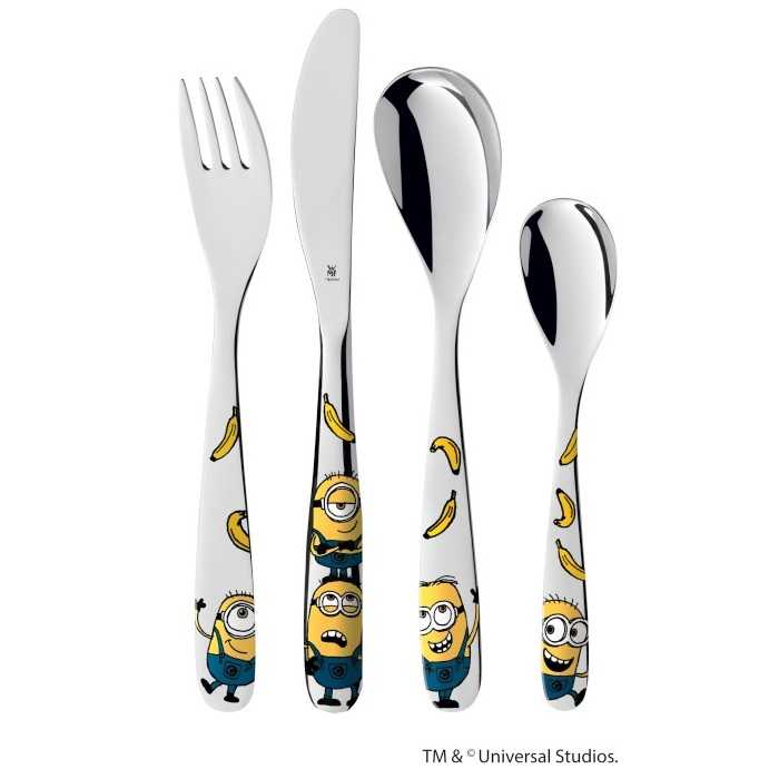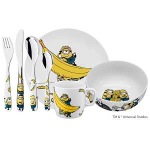 Набор детской посуды WMF Minions 7 предметов (1286079974) состоит из тарелки, чаши и столовых приборов: ножа, вилки, ложки, чайной ложки. Посуда изготовлена из фарфора, столовые приборы из полированной нержавеющей стали 18/10 Cromargan®, устойчивой к царапинам и органическим кислотам. Набор украшен персонажами Minions - поощряет детей, к еде.