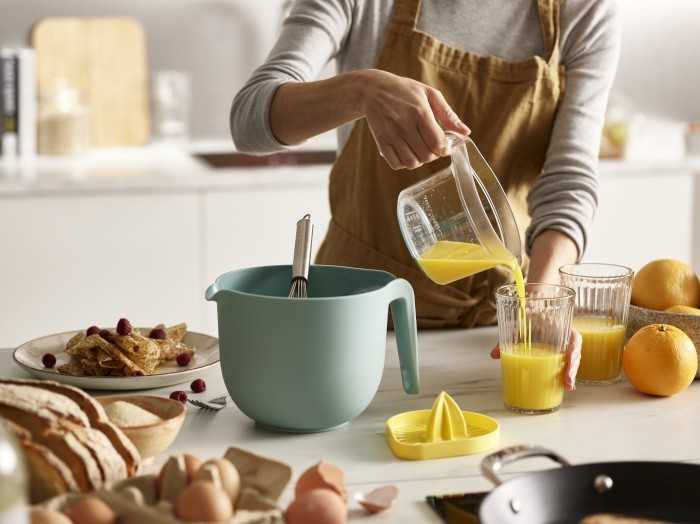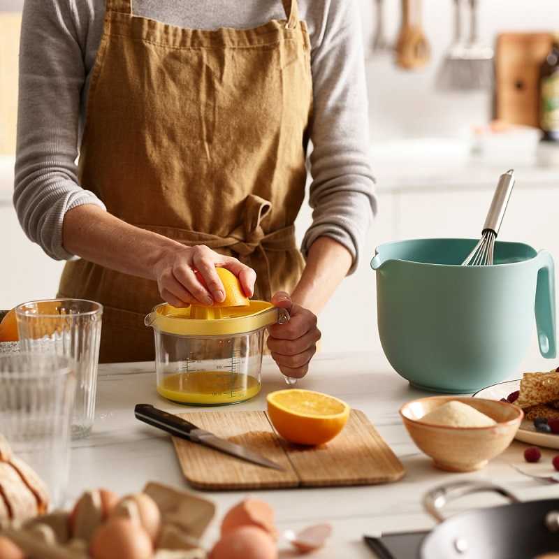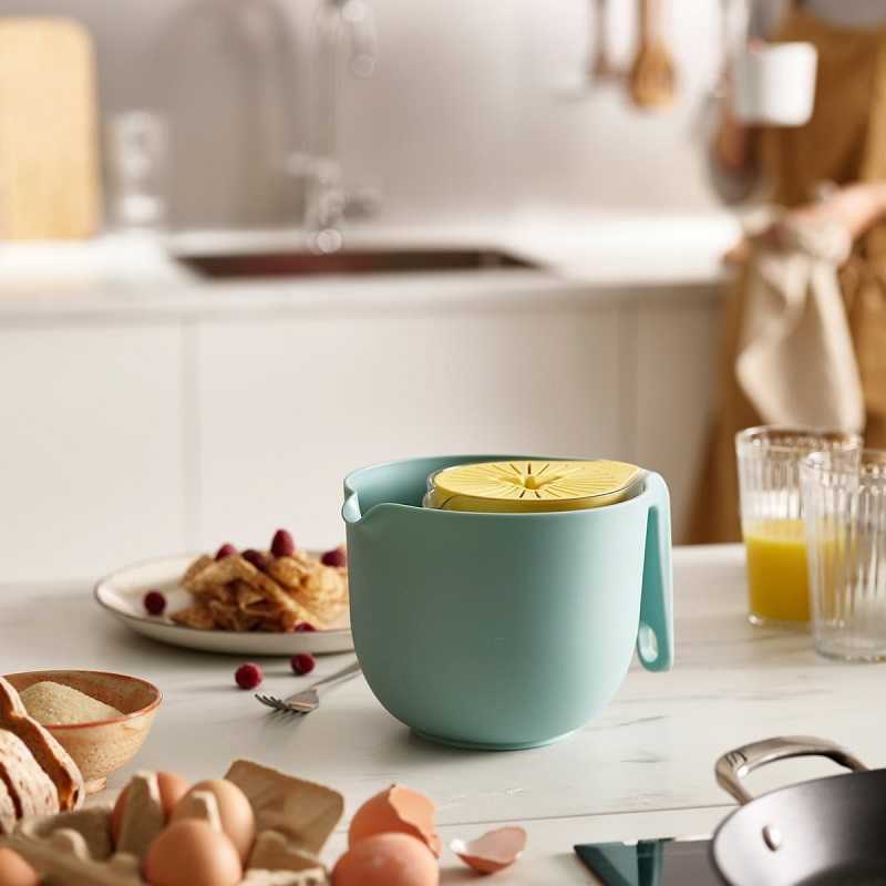 Набір для приготування Joseph Joseph Nest™ Trio (40110) включає чашу 2,5 л, мірну чашку 0,5 л і соковижималку. Усі деталі можна обережно скласти разом для компактного зберігання. Два контейнери мають вертикальні ручки та нековзні підлоги для додаткової стійкості та чіткі одиниці виміру для точного зчитування. Соковитискач точно поміщається в мірну чашку, тому можна вичавити рівно стільки соку, скільки потрібно для даного рецепту.