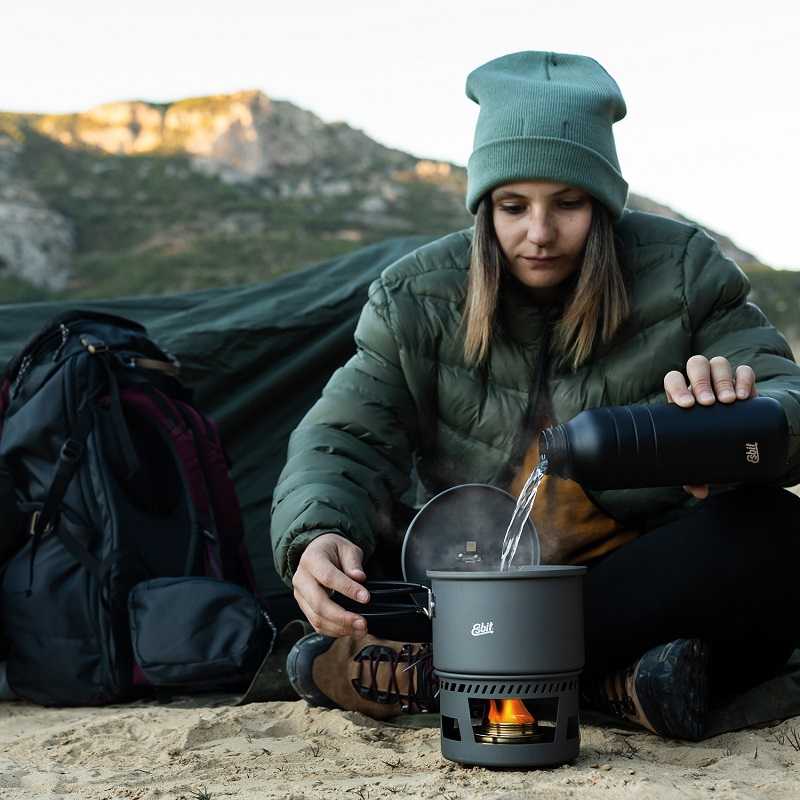 Esbit Solid Fuel Cookset 1500 зручний у використанні та дозволяє приготувати свіжу та гарячу їжу для однієї чи двох осіб. На боці горщика також є шкала об'єму в мл і унциях. У свою чергу, кришка має вбудовану додаткову ручку з внутрішньої сторони, завдяки якій ви можете повісити її на каструлю під час перемішування страви. У комплект входить великий пальник, оснащений спеціальною ручкою, що регулює кількість вогню.
