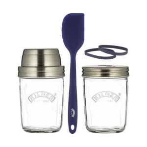У набір входять: 2 баночки ємністю 350 мл, стандартна кришка, кришка - мірний ковпачок, 2 ущільнювачі, силіконовий шпатель, 6 етикеток, книга рецептів.