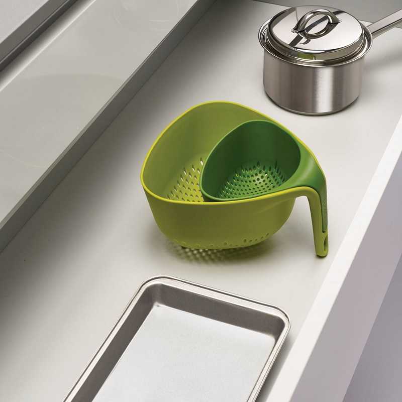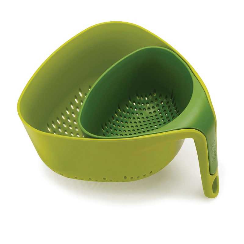 Набір друшляків Joseph Joseph Nest™ (40093) виконує декілька унікальних функцій. По-перше, вертикальна ручка забезпечує стійкість та вертикальне положення в раковині, дозволяючи одній руці керувати краном. По-друге, трикутна форма дозволяє легше і точно спорожняти продукти. По-третє, рідини швидко та ефективно стікають через вертикальні отвори.